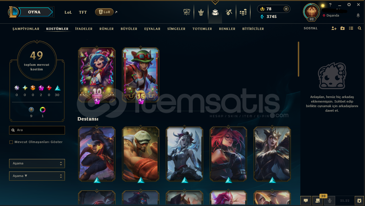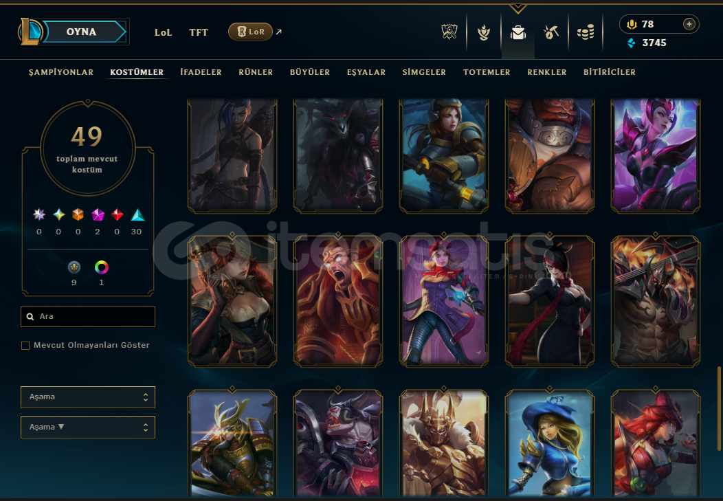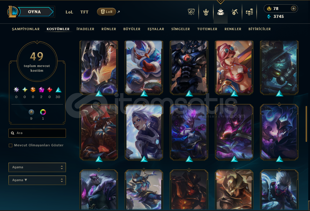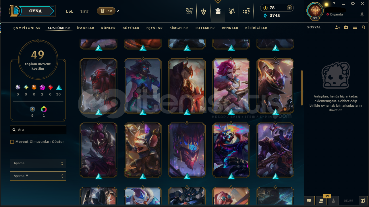 Hesabın E-Posta'sı ve Tüm bilgileri değiştirilebilir.Teslimatlar Otomatik Yapılmaktadır, 7/24 satın alır almaz tüm hesap bilgilerine ulaşabilirsiniz...Dereceli Direkt Girilebilir.3745 Mavi Öz & 834 Turuncu Öz + 11 Anahtar Bulunmaktadır.Hesabınızı satın aldıktan sonra sizden başka kimsenin erişimi olmaz.92 Level - UNRANKED (TR) Hesaptır.49 Kostüm ve 114 Şampiyon b...