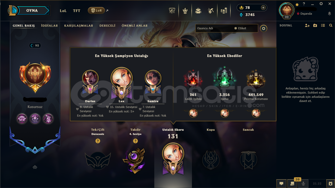 92 Level - UNRANKED (TR) Hesaptır.