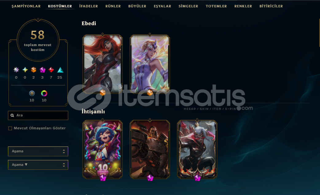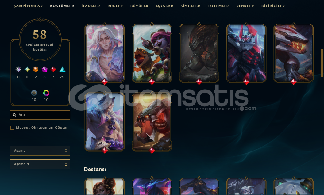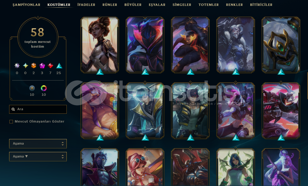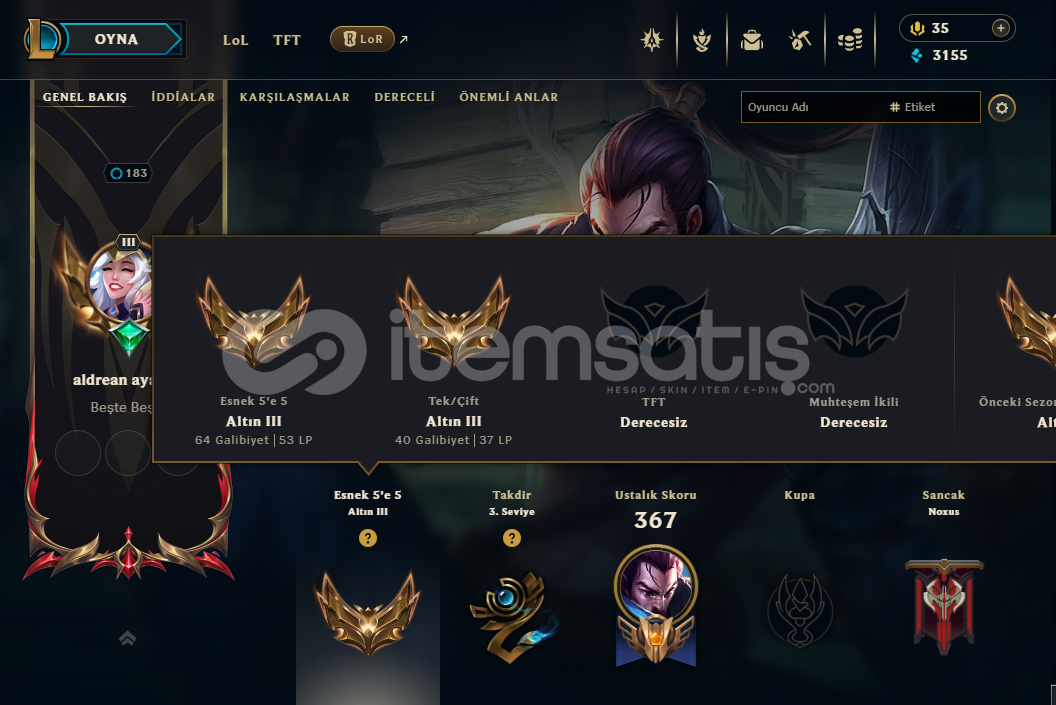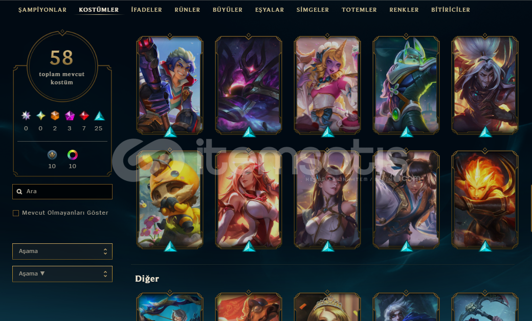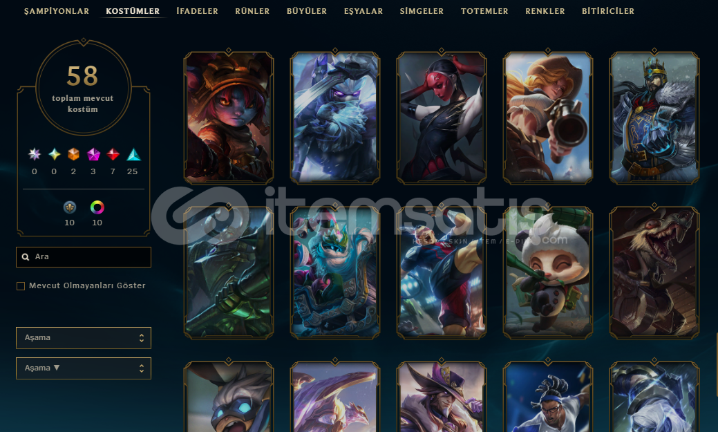 artık lol oynamadığım için satıyorum emek hesap mail devri ve tel no degiştirilip verilecektir fotoraflardaki herşey olduğu gibidir alana simdiden hayırlı olsun