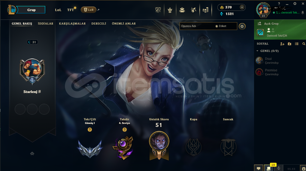 full handmade hesaptır. 2012 tarihli eski hesaptır mainlemelik +38 lp gelir -10 lp gider rank macları yeni atıldı silver 1 güncel rankı. Hesap tamamen üzerinize devredilecektir.