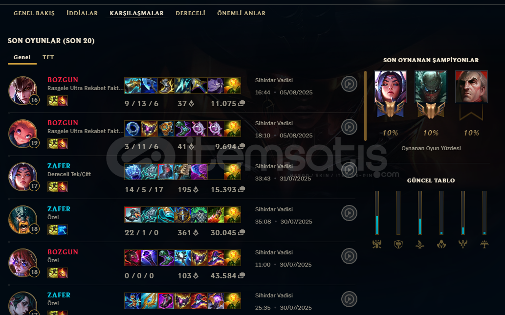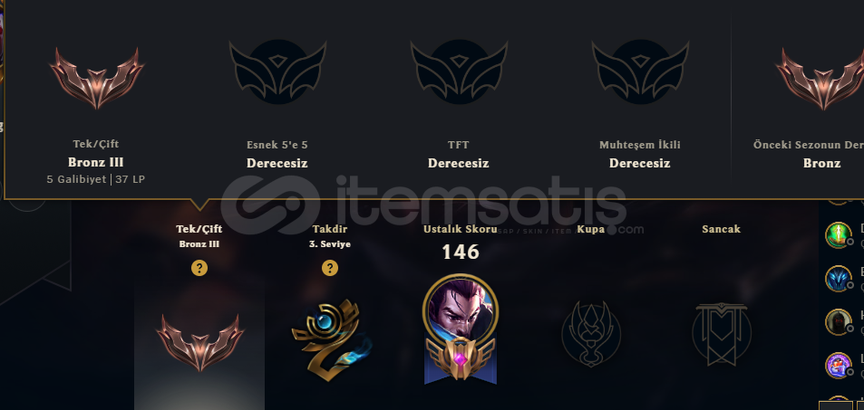 HESAP TR SERVERHESAP SEVİYESİ 79 LEVELRANKED GİRİLEBİLİRHESAPTA 16 ADET SKİN MEVCUTHESAP SATIN ALDIKTAN SONRA MAİL-ŞİFRE-TELEFON DEĞİŞTİREBİLİRSİNİZ