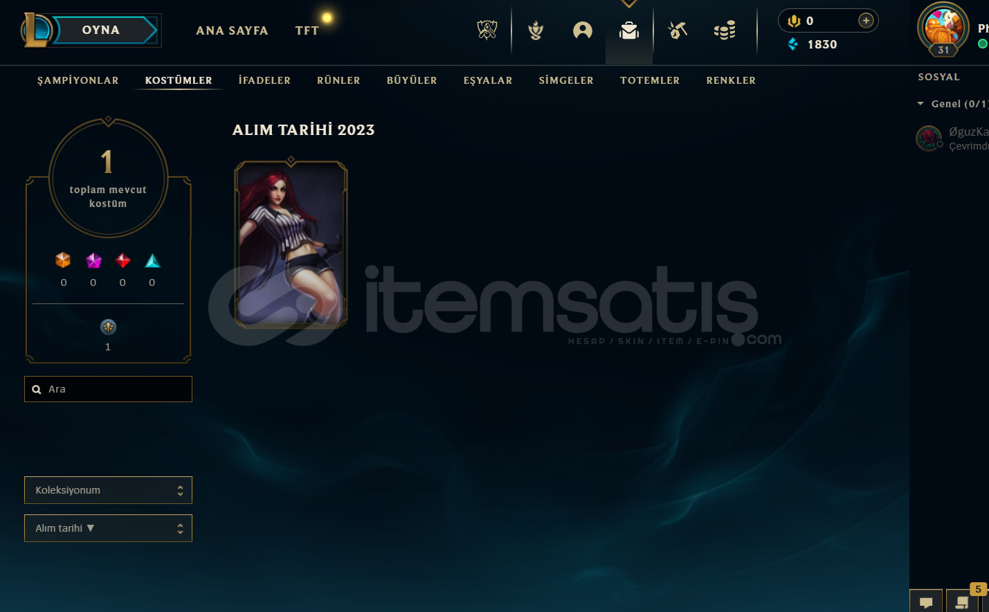 Hesap 31 Leveldir.Hesap içinde (1 Hatıra kostüm bulunur.) (Ganimette ise 1 destansı vardır.)Hesap WR Yüksektir.Hesap kendi ellerimle kasılmıştır.Mail değişelecektir.Hesap içindekiler. (Hakem Katerina )Ganimette Olan Kostümler. ( Kumların Muhafızı Rengar )Hesabın Rankı (Gold.)Hesapta Ufakta Olsa PAZARLIK Olur.