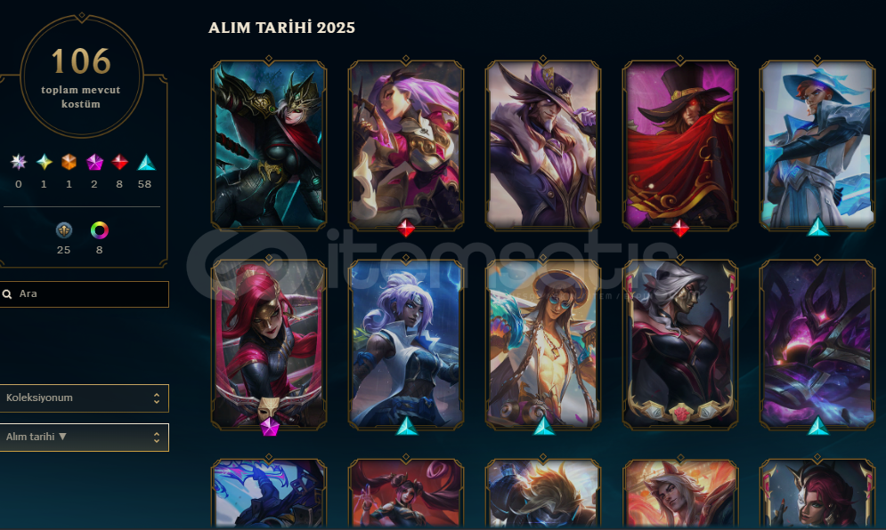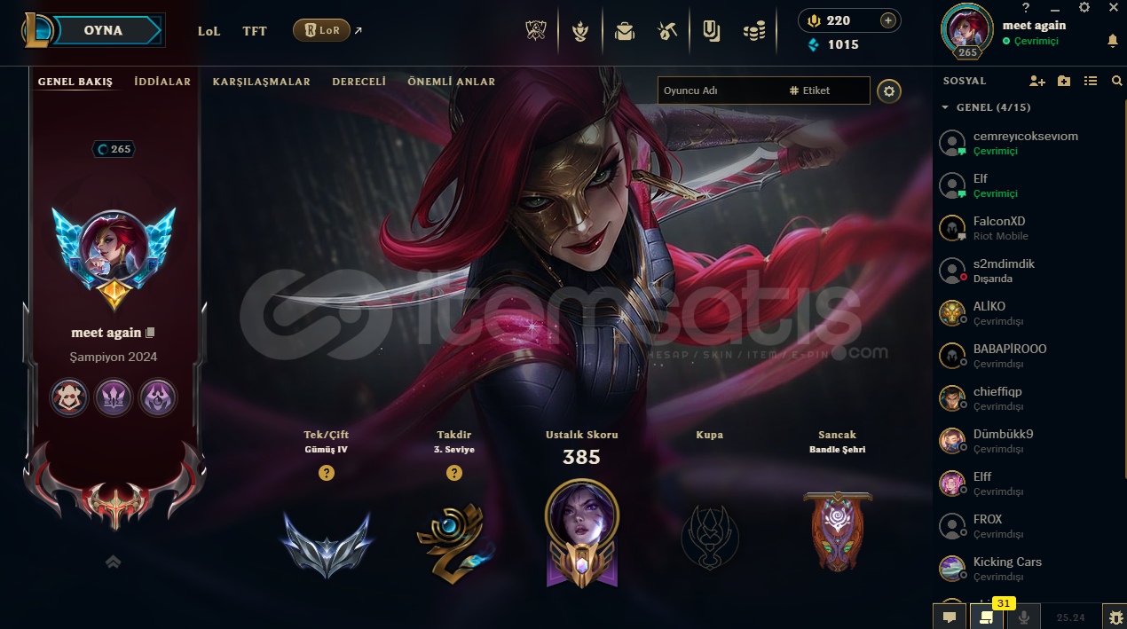 265 LVLHesapta 35 karakter yok.106 Skin vardır.a110 İfade165 Simge23 TOTEM220 RP bulunmaktadır.HESAPTA 32000RP DEĞERİNDEKİ SETT KOSTÜMÜ VARDIR.SORUNUZ OLURSA DM'DEN YAZINIZ.