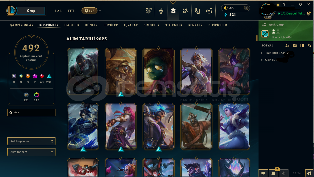 Dolu dolu kozmetikli grandmaster MMRlı hesaptır.İçinde bir çok değerli kostüm varYeni nesil kostümlerden ziyade nostajik kostümlerle doludur.örneğin:2012 Dünya Şampiyonası Riven2016 Dünya Şampiyonası ZedPrestij True Damage YasuoElementalist LuxPulsefire EzrealRuh bekçisi Udyr10. Yıl AnniemoDraven Dravenvb. dolu dolu kozmetiklidir. ufak miktarda da olsa pazarlık payı vardır.Mail tes...