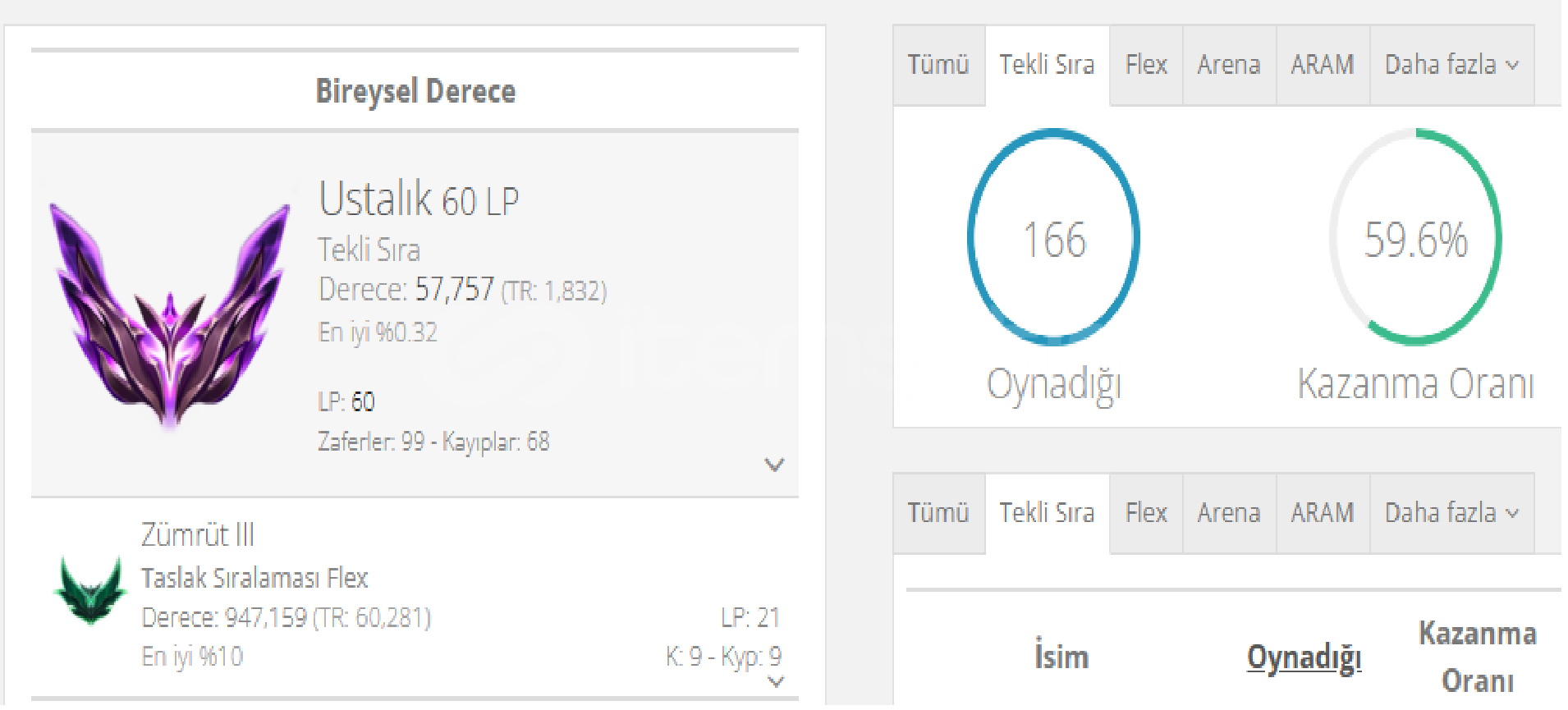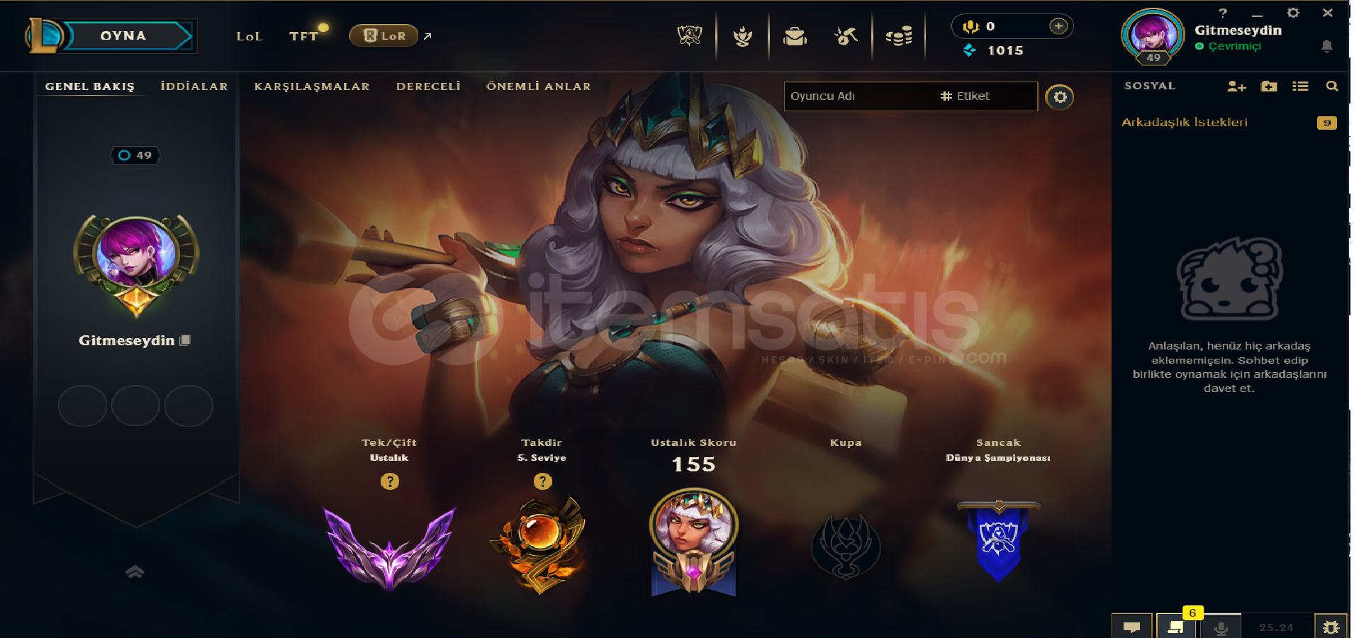 Hesap master 60 lp +20 gelip -20 gidiyor 5. seviye takdir herhangi bir banı bulunmamakda ganimetinde güzel kostümleri var açılmamış toplam 166 maç 59,6 wr si vardır hafif bir pazarlık olur mail değişimi yapılacaktır