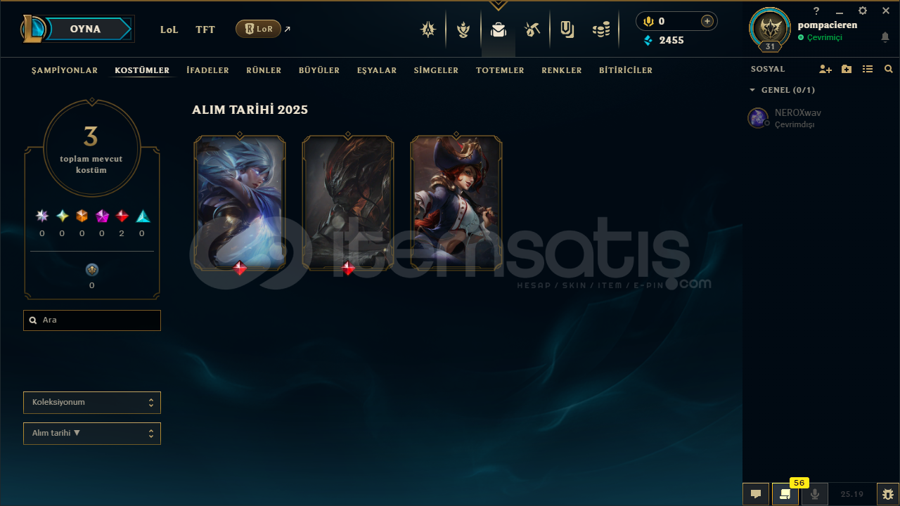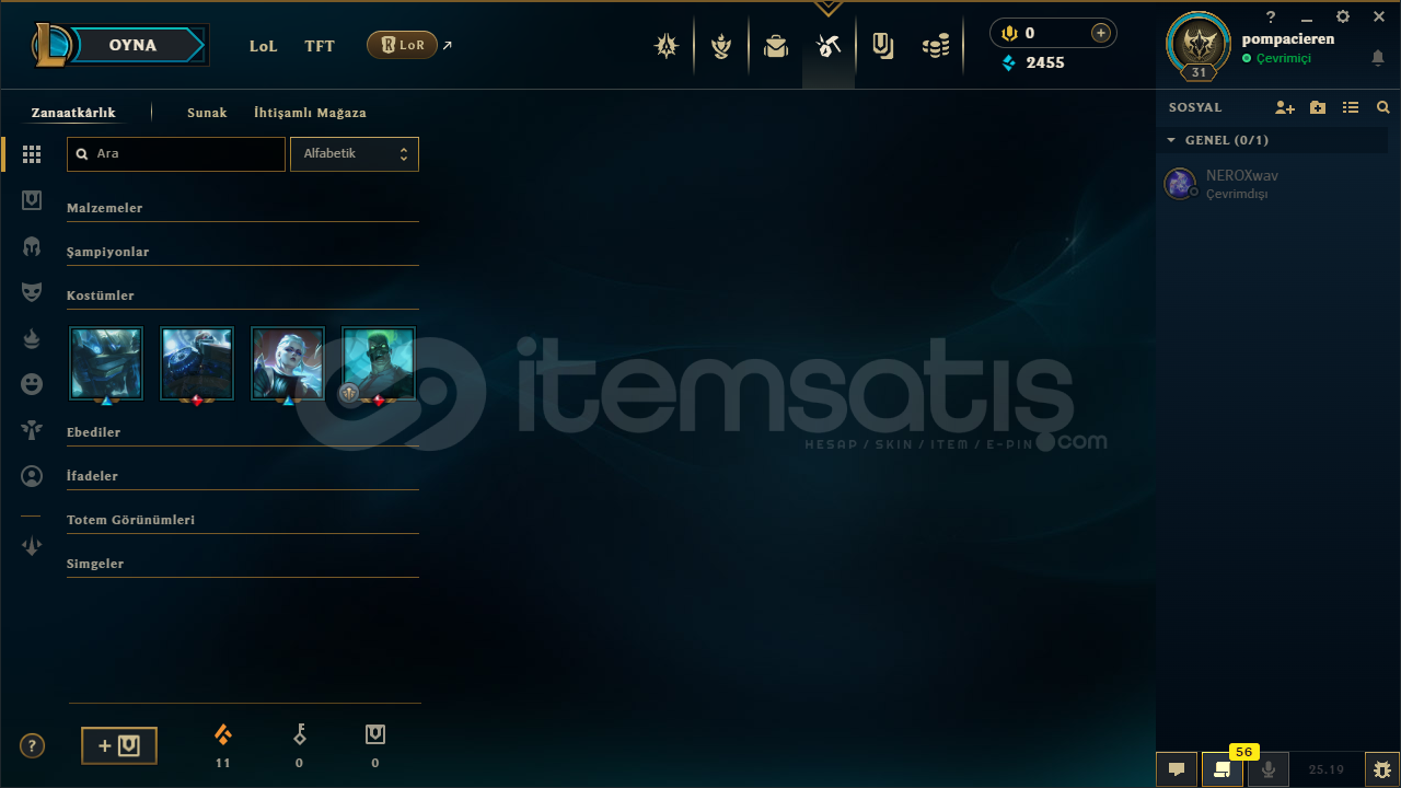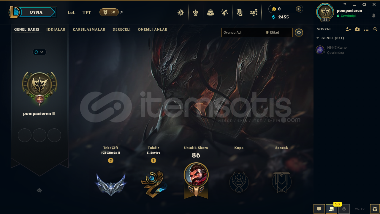 MAİL ONAYSIZ fresh acc 1-1 mükemmel skinli görebileceğiniz en iyi skinli fresh hesap böylesi yok full 1820 rp skinler mevcut ranked silver sadece 2 oyun oynanmıştır anında teslimat