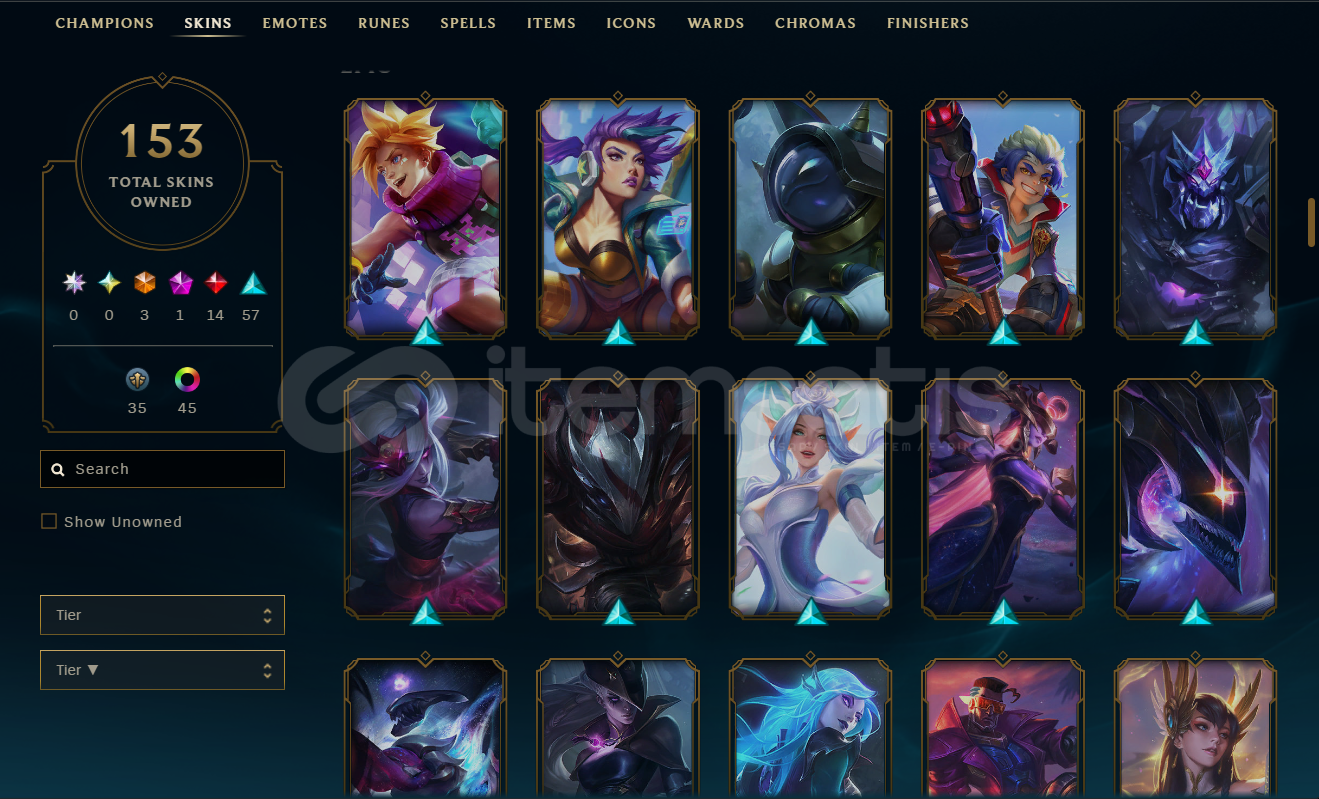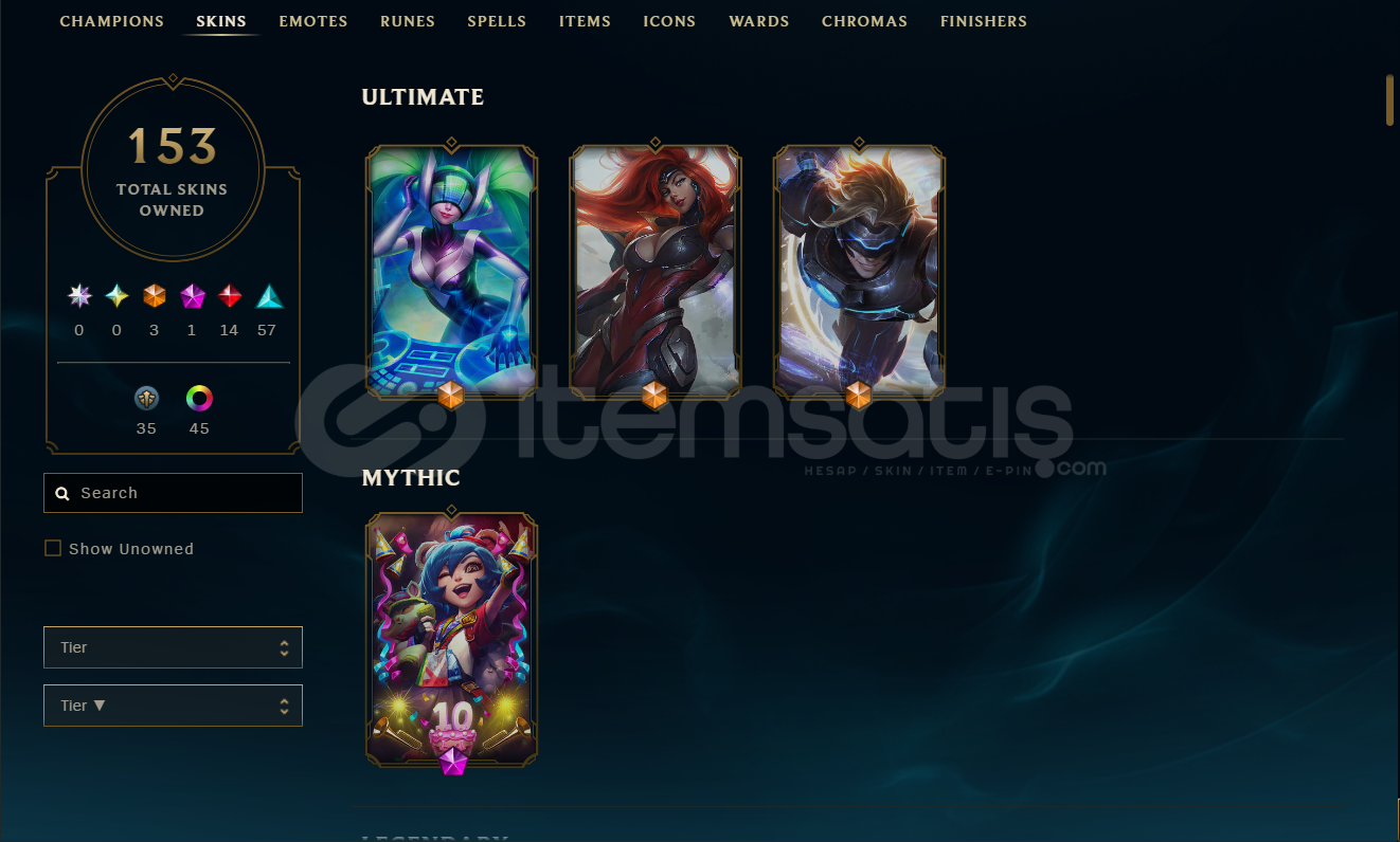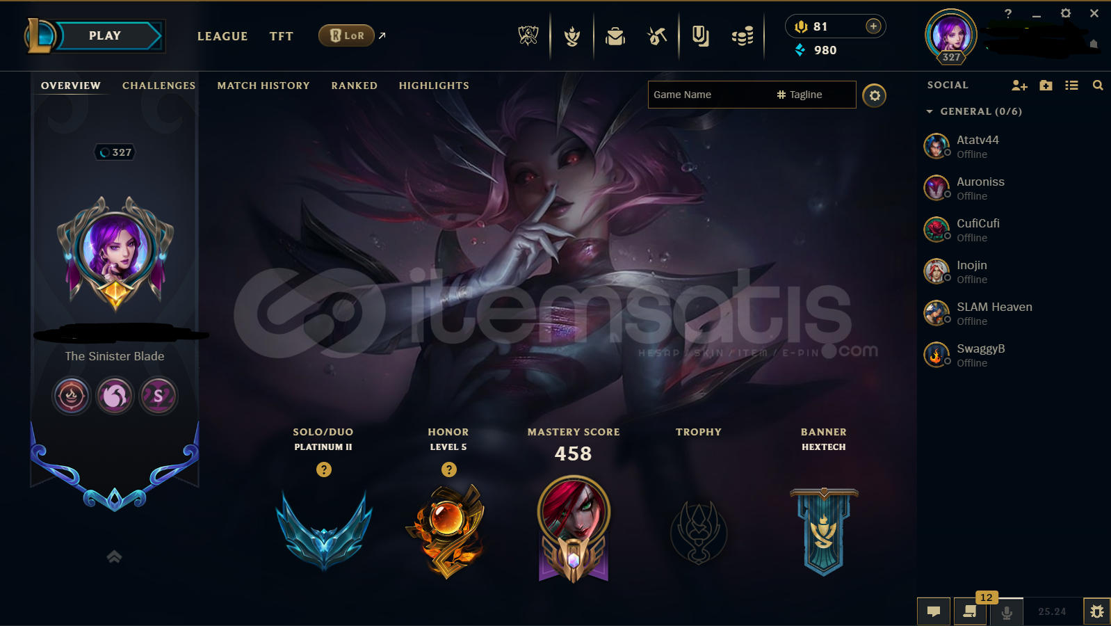 NOT : HESAPDA KAZANINCA +26 VERIYOR SON MAÇLARIMDA HEP +26 ALDIM.HESABI SATIŞ NEDENİM PARAYA İHTİYACIMIN OLMASIHESAP katarina mainlere özeldir14 legendary 57 epic 153 kostüm bulunmaktadırÇERÇEVELİ KOSTÜMLERKDA ALL OUT KAI'SAPULSEFIRE LUCIANVAHŞİ BATILI TALONVAHŞİ BATILI KATARINA