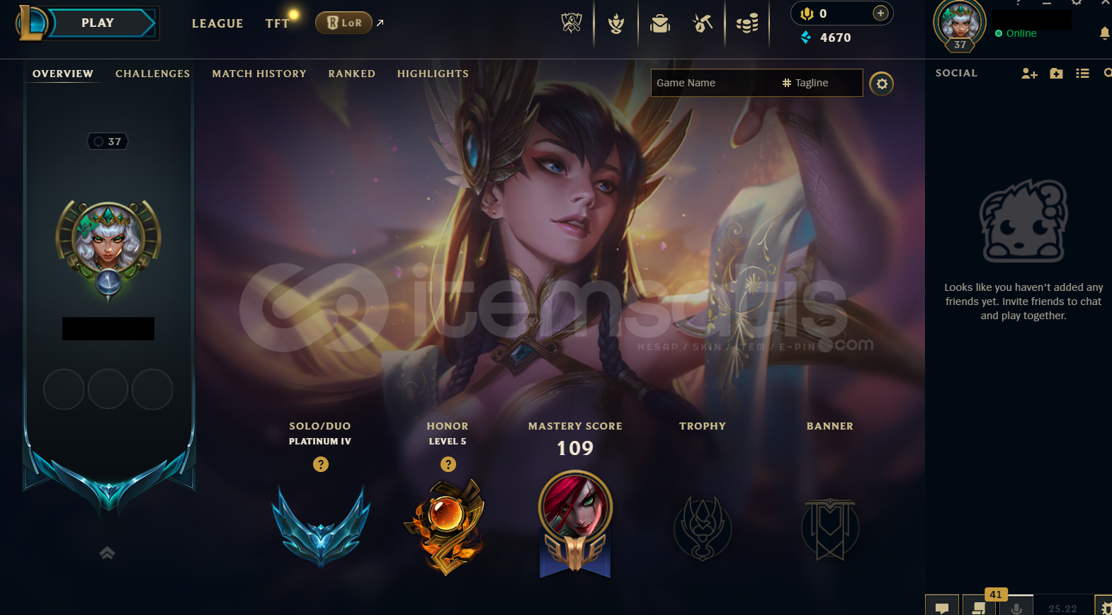 Hesap TR Tek/Çift Plat 4 - 76 Lp - 20 Win 15 Lose 57 Winrate - Esnek Plat 2 - 40 Lp - 2 Win 2 Lose 50 Winrate TR LoL Hesabıdır. Geçen Sezonu Plat Bitirmiştir.