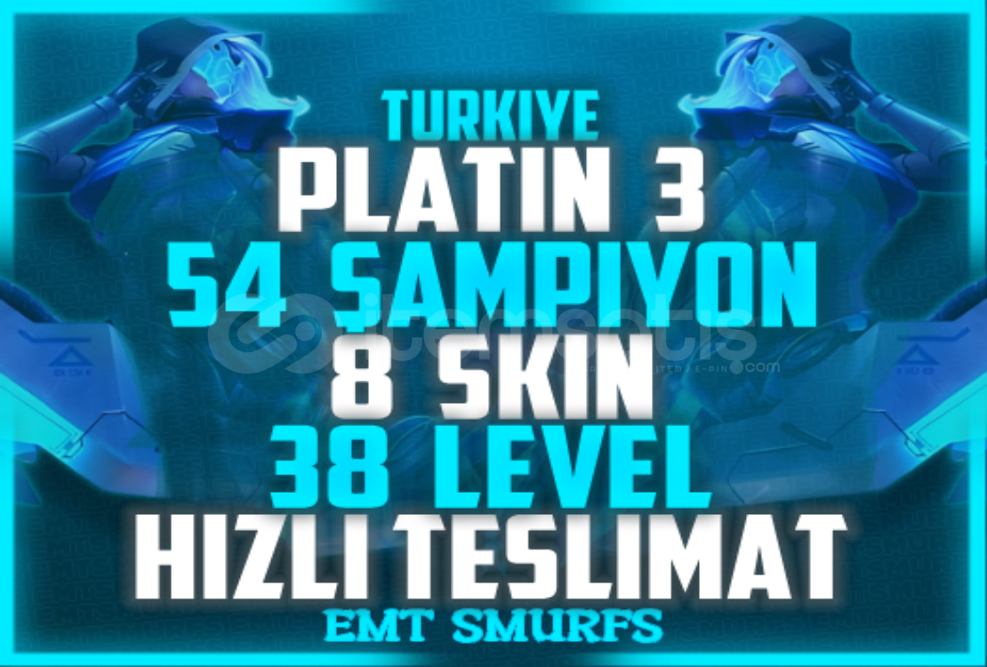 Direkt Olarak Sipariş Verebilirsiniz Otomatik Teslimat Vardır.+4000 Başarılı Satış ile EMT Smurfs Güvencesiyle.Sunucu: TRGüncel Tek/Çift Rank: Platinum III (45 LP)Level: 38Honor Level: 5Mavi Öz: 783Şampiyon Sayısı: 54Kostüm Sayısı: 8Kostümler:Medieval Twitch, Three Honors Shen, Masque of the Black Rose Elise, Three Honors Akshan, Fae Dragon Ashe, Grey Warwick, Medieval Twitch, Victorious Twisted Fate, Vic...