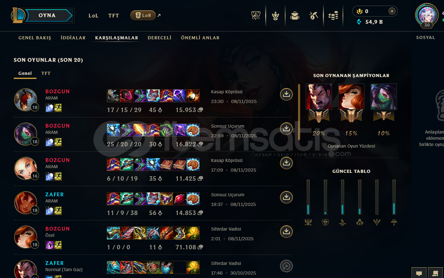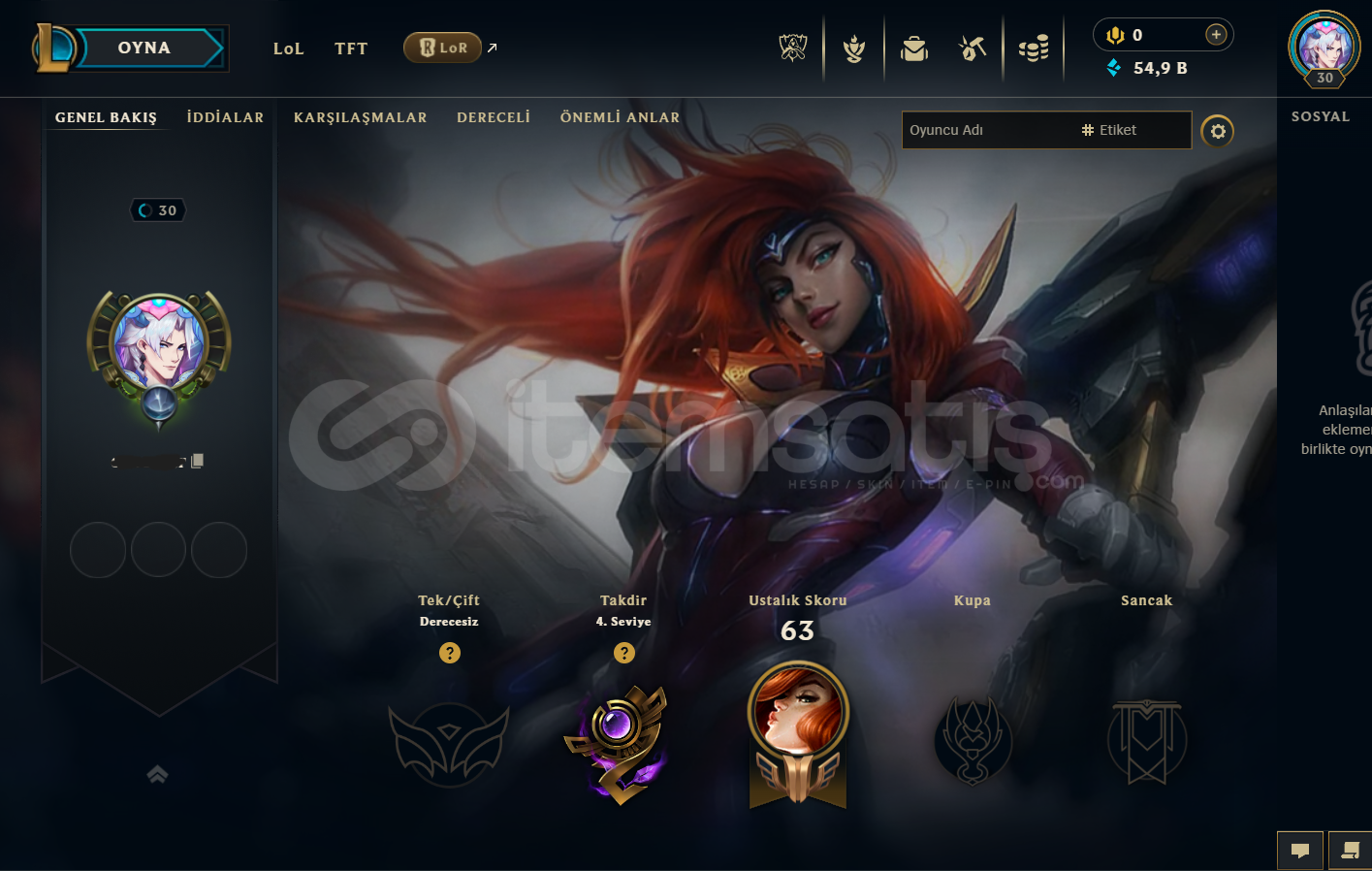 TR Ranked hazır hesap tamamen el ile kasılmıştır; script, hiIe ve bot kesinlikle kullanılmamıştır. 10 Sihirdar Vadisi maçından 9 galibiyet, 1 mağlubiyet vardır. Hiç ban yememiş temiz bir hesaptır. E-posta onayı yapılmamıştır. Takdir seviyesi 4tür. (OTO TESLIM)