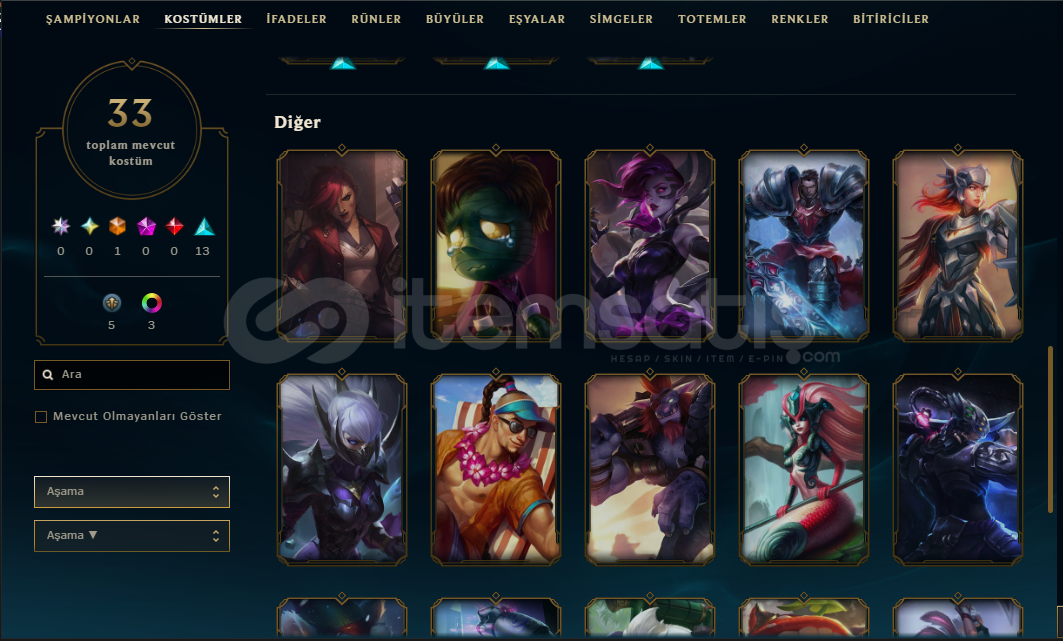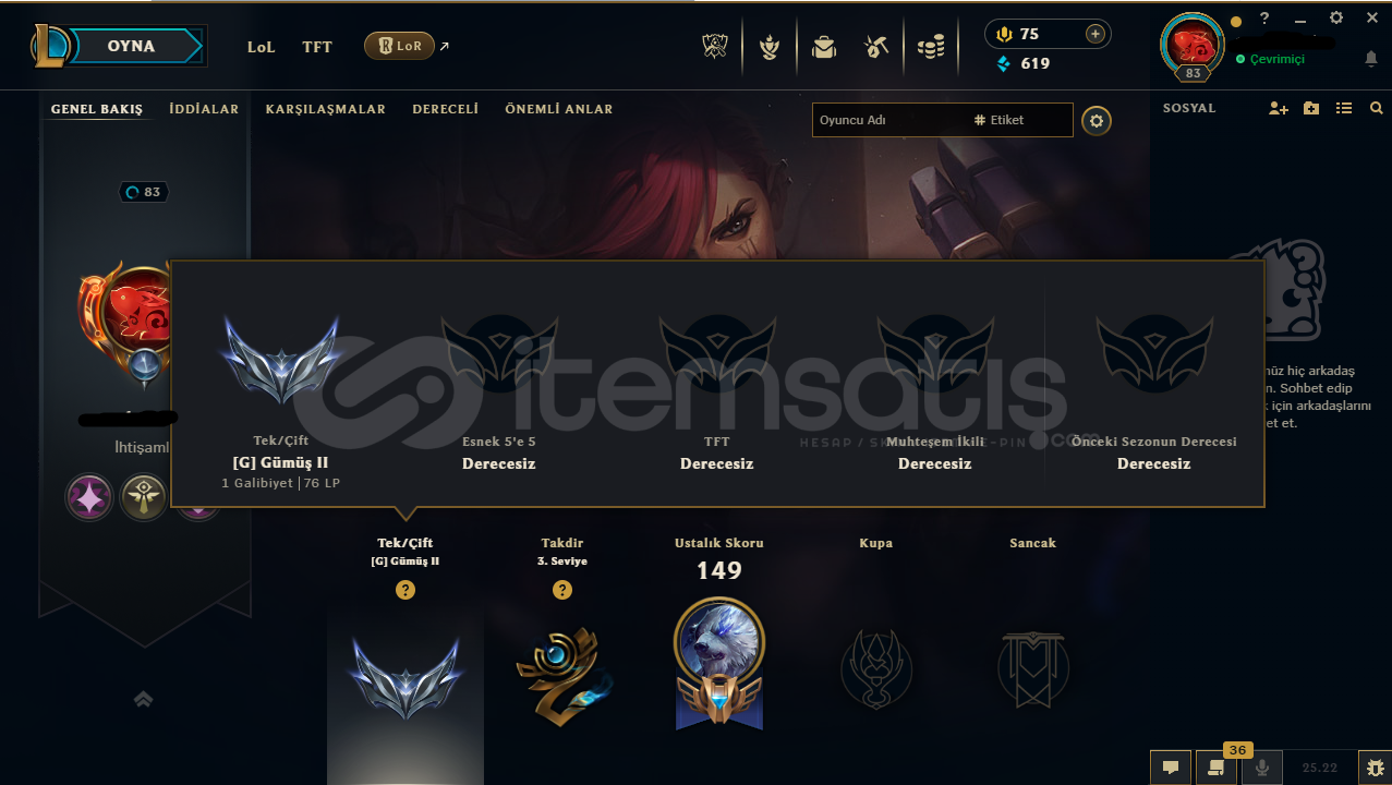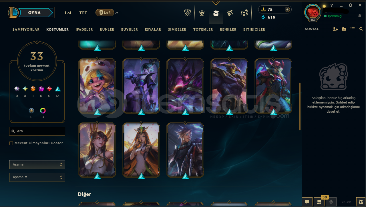 Hesabın E-Posta'sı ve Tüm bilgileri değiştirilebilir.Teslimatlar Otomatik Yapılmaktadır, 7/24 satın alır almaz tüm hesap bilgilerine ulaşabilirsiniz...Dereceli Direkt Girilebilir.619 Mavi Öz & 2171 Turuncu Öz Bulunmaktadır.Hesabınızı satın aldıktan sonra sizden başka kimsenin erişimi olmaz.83 Level - SİLVER2(TR) Hesaptır.33 Kostüm ve 75 Şampiyon bulunmaktad&...