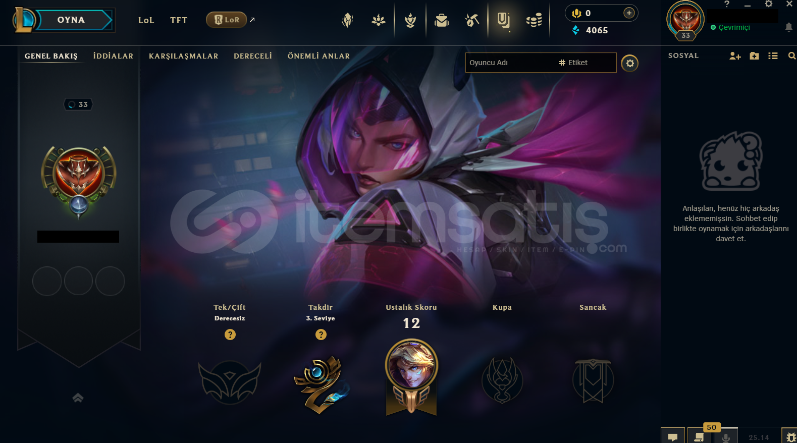 HESAP DETAYLARI:Hesap hiç ban yememiştir ve takdir seviyesi 3 dür.Hesap TR Unranked LoL Hesabıdır.İçerisinde 1 Kostüm 23 Hero 3 Adet İade Hakkı Mevcuttur.HESAP HAKKINDA:Kendi mail adresinize kayıt edebilir, etkinleştirmeyi kaldırabilir ve şifresini değiştirebilirsiniz.Hesaplarımızda hiç bir sıkıntı çıkmamaktadır.Herhangi bir sıkıntıda en iyi deste...