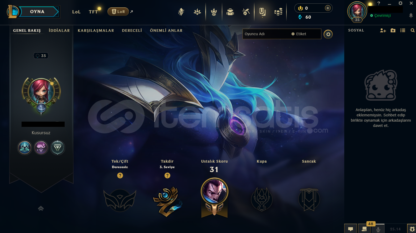 HESAP DETAYLARI:Hesap hiç ban yememiştir ve takdir seviyesi 3 dür.Hesap TR Unranked LoL Hesabıdır.İçerisinde 3 Kostüm 30 Hero 3 Adet İade Hakkı Mevcuttur.HESAP HAKKINDA:Kendi mail adresinize kayıt edebilir, etkinleştirmeyi kaldırabilir ve şifresini değiştirebilirsiniz.Hesaplarımızda hiç bir sıkıntı çıkmamaktadır.Herhangi bir sıkıntıda en iyi deste...