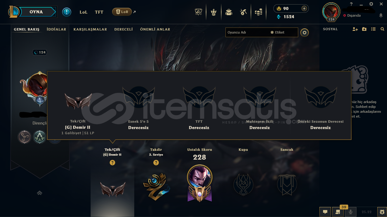 124 Level - SoloQ/Demir 2(TR) Hesaptır. Hesapta daha dereceli yerleştirme maçları atılmadığı için rankı daha yüksek bitirebilir.