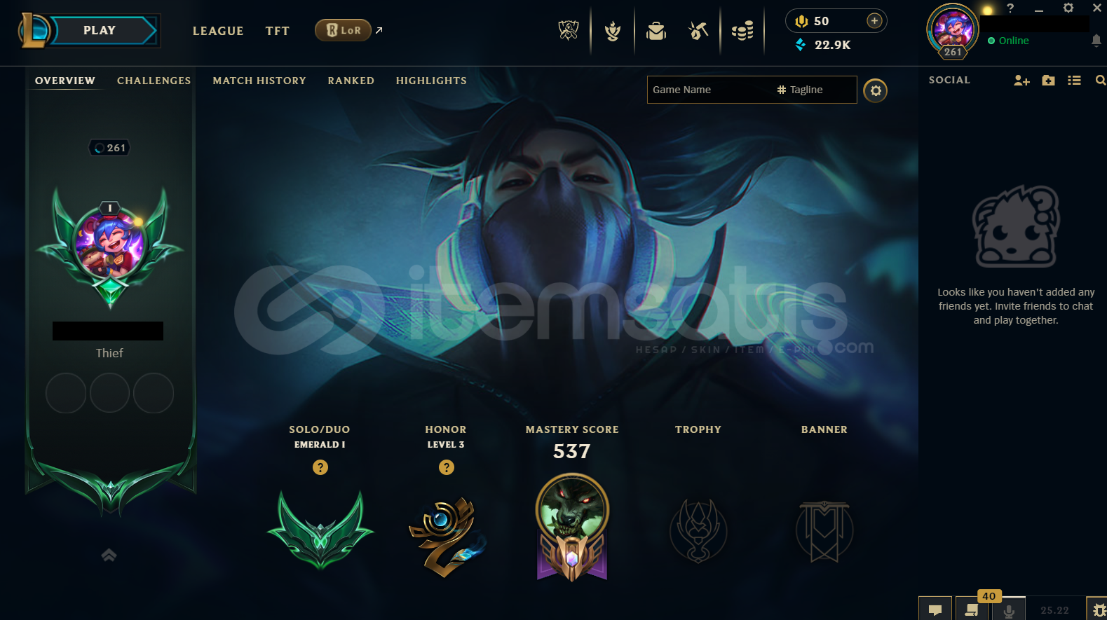 Hesap TR Tek/Çift Zümrüt 1 - 51 Lp - 57 Winrate - Esnek Plat 3 - 45 Lp - 56 Winrate TR LoL Hesabıdır. Geçen Sezonu Zümrüt Bitirmiştir.