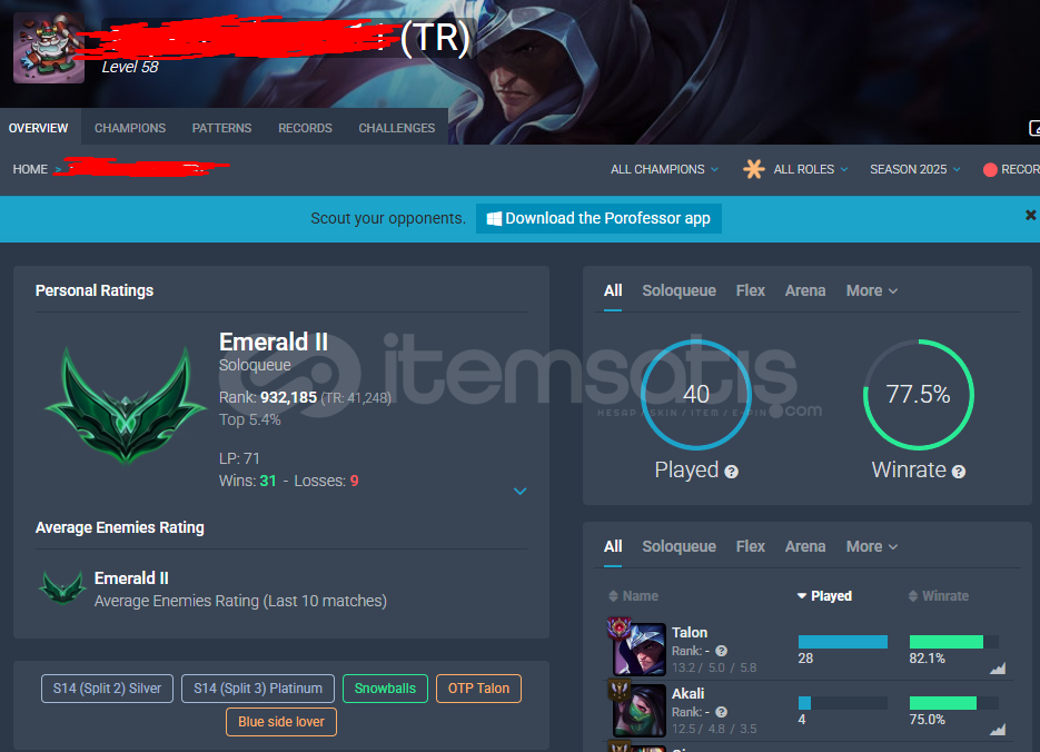 3 yilda 45 basarili islem yuzde 100 basari 0 sikintili hesap / 111 sampiyon 2013te acilmis eski hesap eskiden lvl 20-30a kadar oynanip birakilmistir son 2 sezon yuksek wr ile emeralda kasilmistir ban risksiz