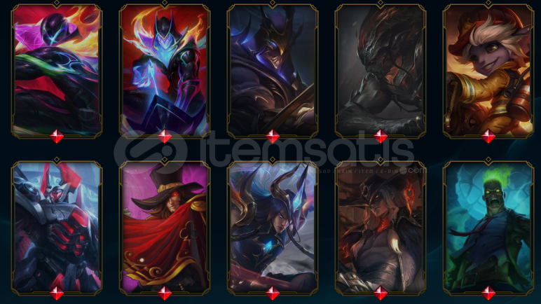 1 ebedi, 4 ihtişamlı, 10 efsanevi, 65 destansı, 18 hatıra kostümle beraber 42 renk paketi, 157 ifade, 130 simge, 30 totem bulunmaktadır.