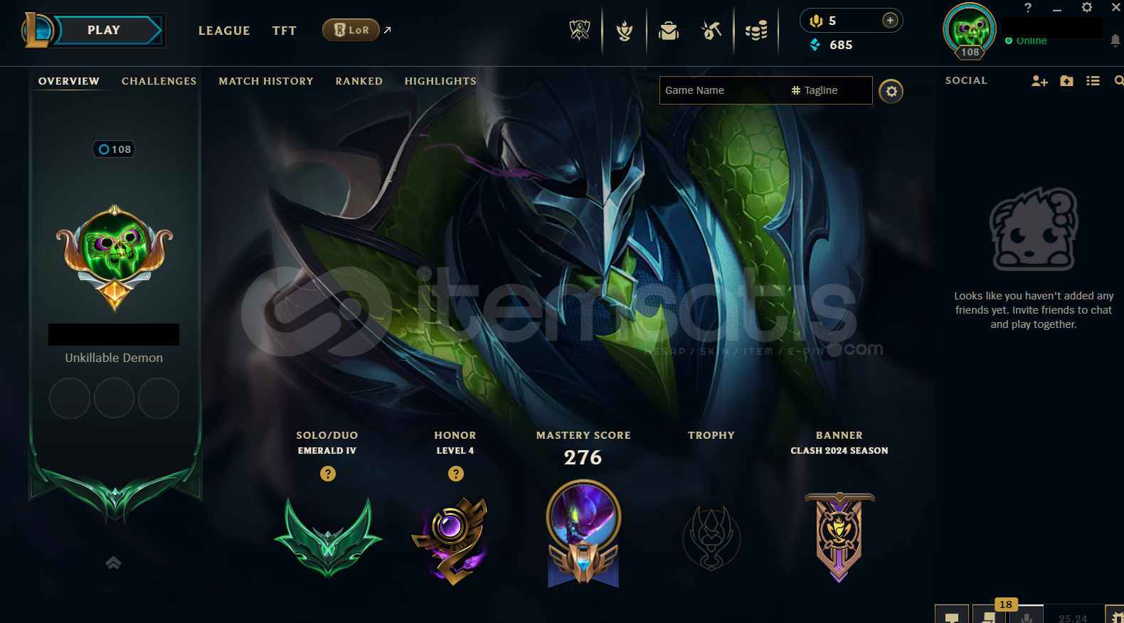 Hesap TR Tek/Çift Zümrüt 4 - 50 Lp - 13 Win 18 Lose - Esnek Gold 3 - 30 Lp - 6 Win 1 Lose TR LoL Hesabıdır. Geçen Sezonu Zümrüt Bitirmiştir.