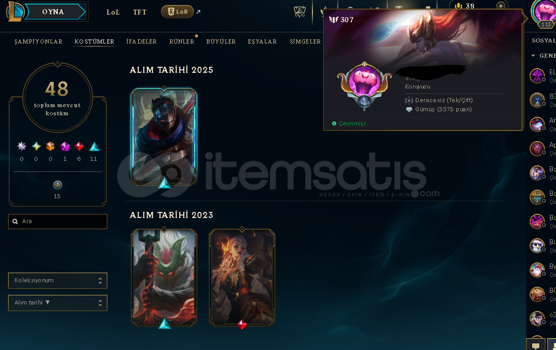 HESAP 113 SEVİYEDİR48 KOSTÜM MEVCUTTURRANKI PLATİNDİR AMA BU SEZON BELLİ DEGİLDİR GİRİLMEMİŞTİR ON NUMARA HESAPTIRHESABIN MAİL VE TELEFON NUMARASI PATLAKTIR ERİŞİM İMKANSIZDIRALANA HAYIRLI OLSUN:)