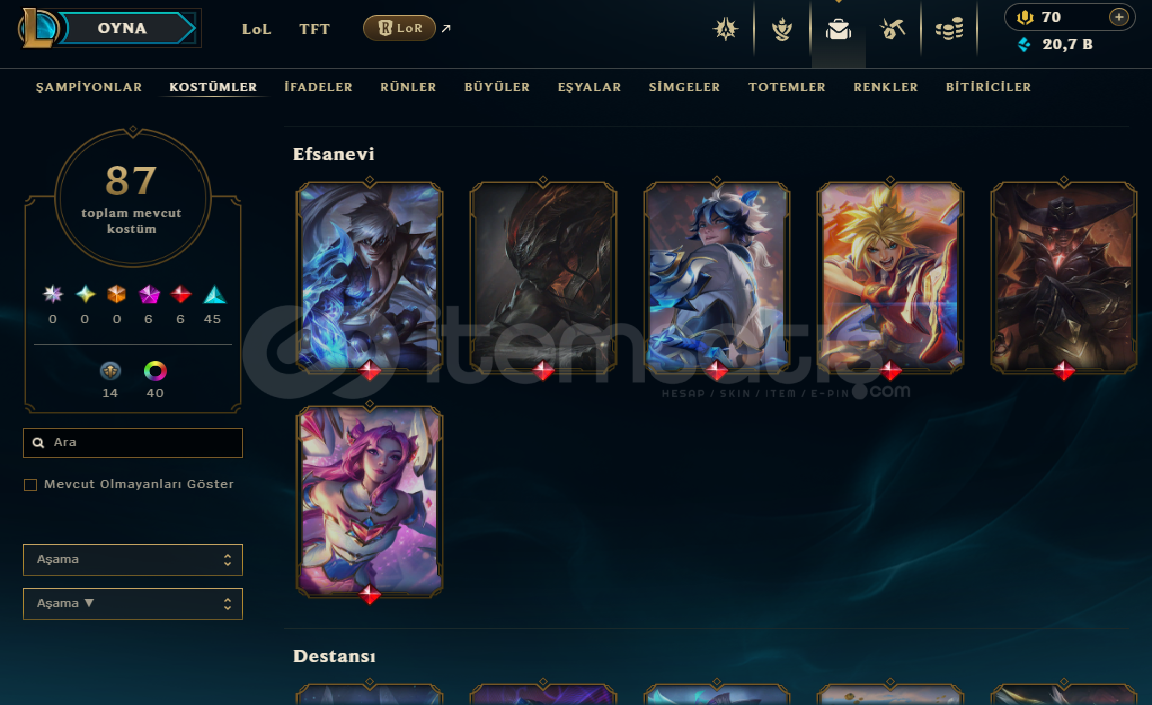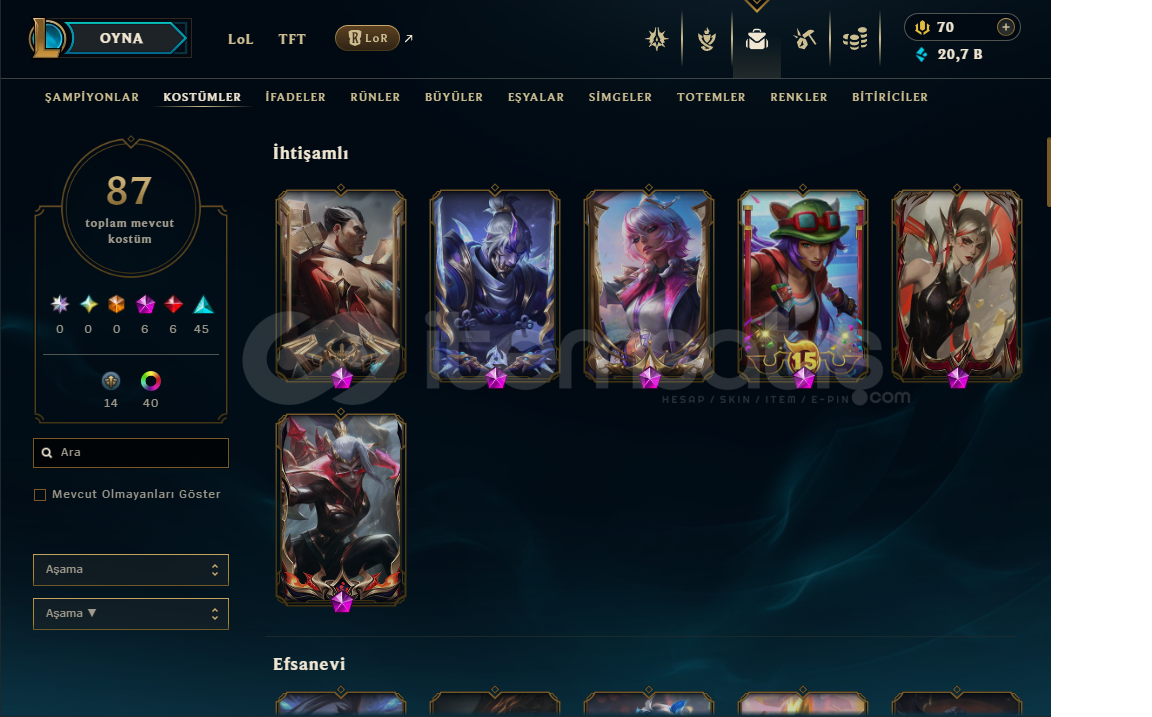 Çok oynamadığım için satıyorum hesap master liginden erime şuanda elmas 2ilk maili mevcuttur6 ihtişamlı6 efsanevi45 destansı30 normalolmak üzere toplamda 87 kostüm mevcuttur içindeki kostümlerin 14 tanesi hatıradır ve 40 tane renk vardırs 14 split 2 split 3 ü de elmas bitirmiştir elmas emotu vardır