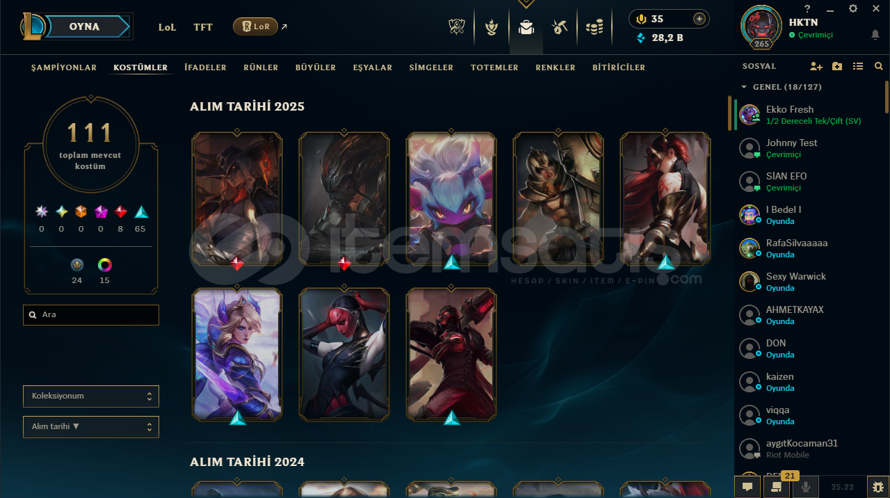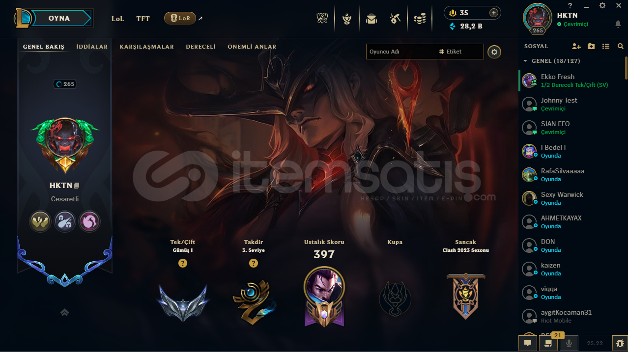 Arkadaşlar hesap tertemizdir LoL ve Valorant hesabımdır alan kişi ikisini de almış olcak , hesap full hero 265 Level 111 kostüm vardır. Aktif olarak solo q ve esnekte gümüş 1'dir. Valo hesabım max Dia gördü içinde champions 2025 seti dahil bi kaç pahalı skin var.