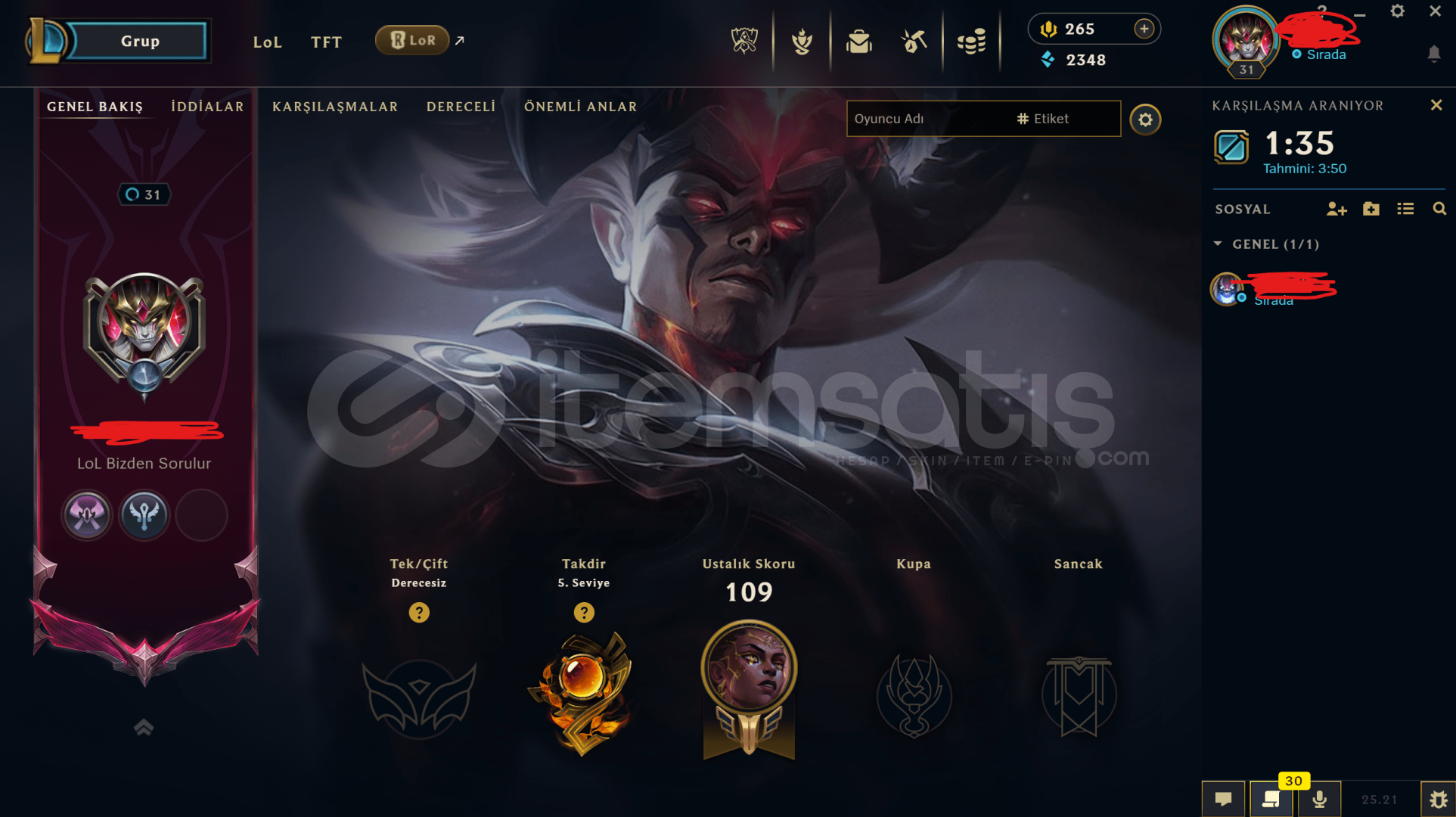 Hesap yeni olduğundan geçmişi tertemiz dereceli maç hiç atılmadı uyarı dahi almadı, hesap yeni olduğundan ilk mail adresini + ve kurtarma bilgilerini verebilirim. fiyatım sondur lütfen pazarlık için yazmayınız. Ufak pazarlıklar düşünülür sadece.
