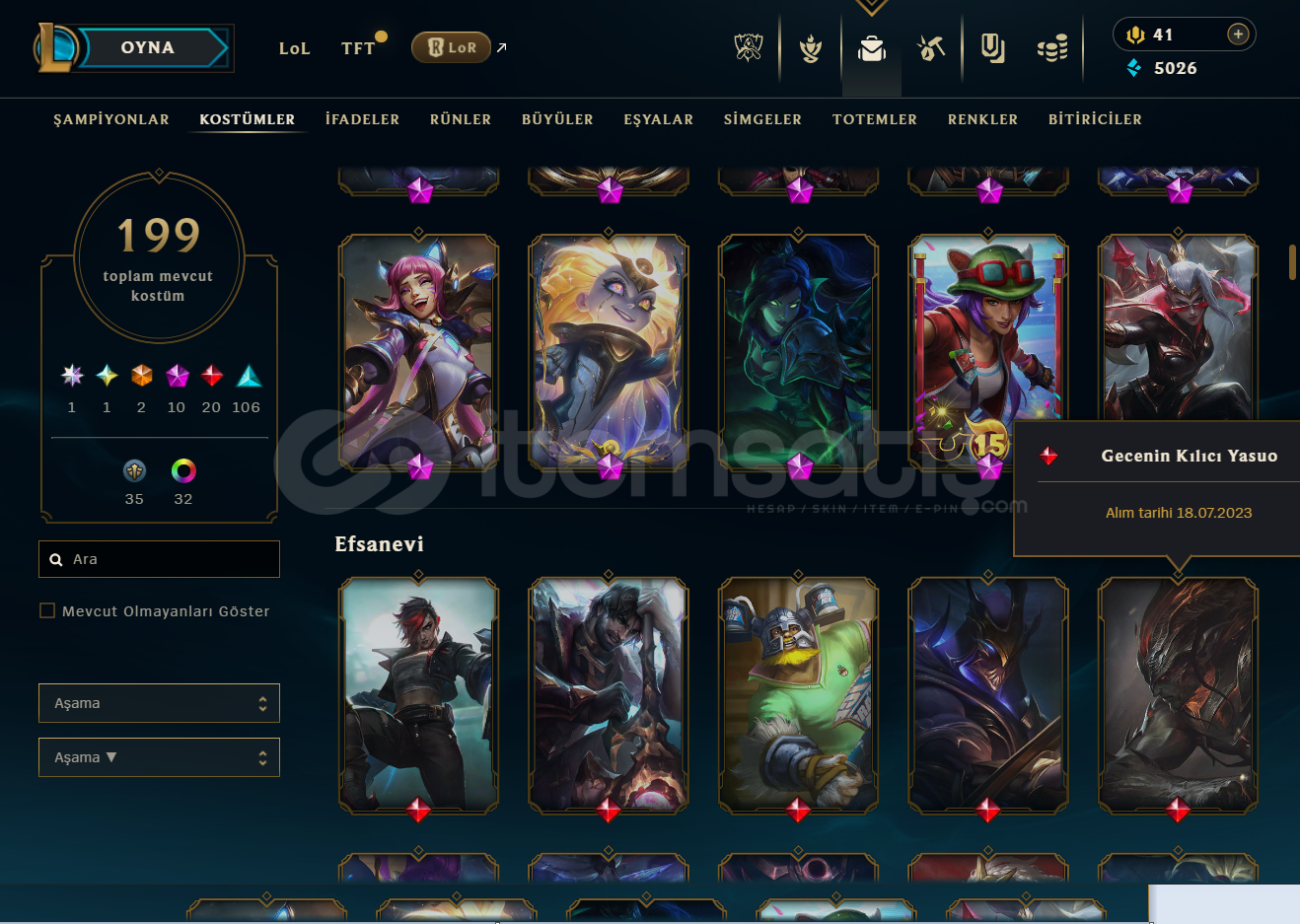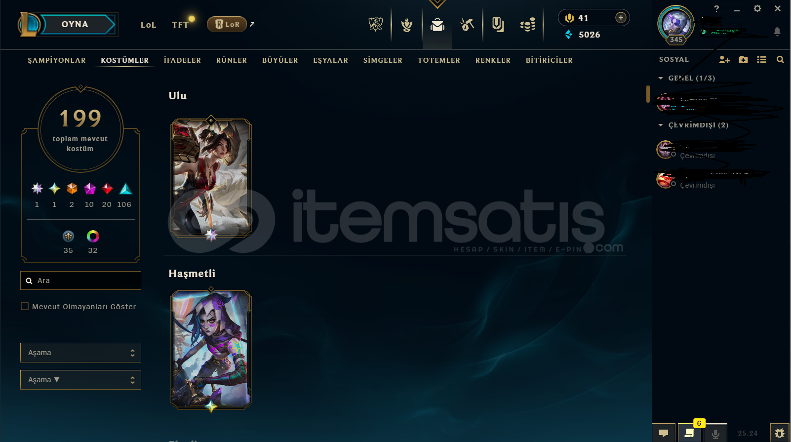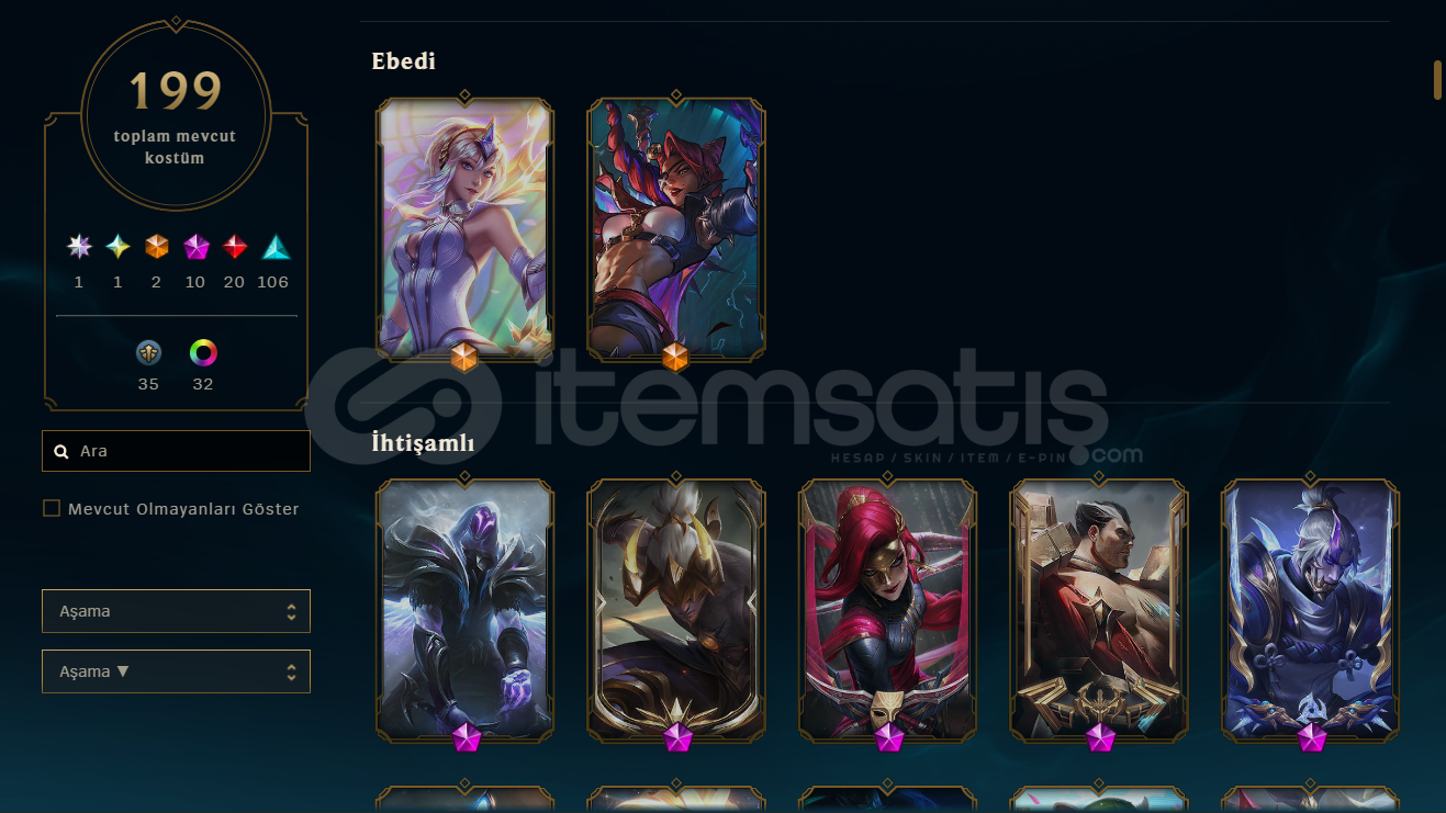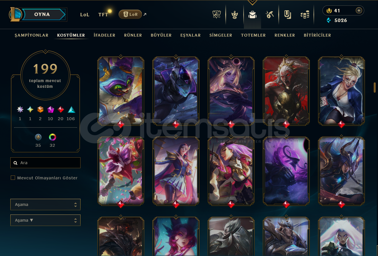 Öncelikle merhabalar hesabımda 200 adet kostüm bulunmakta max karakter durumundadır kostümler tamamen değerli kostümlerdir boş teklifler vs için yazmayınız sadece Arcane jinx fiyatına bile denk gelmiyor kolay gelsin iyi alım satımlar
