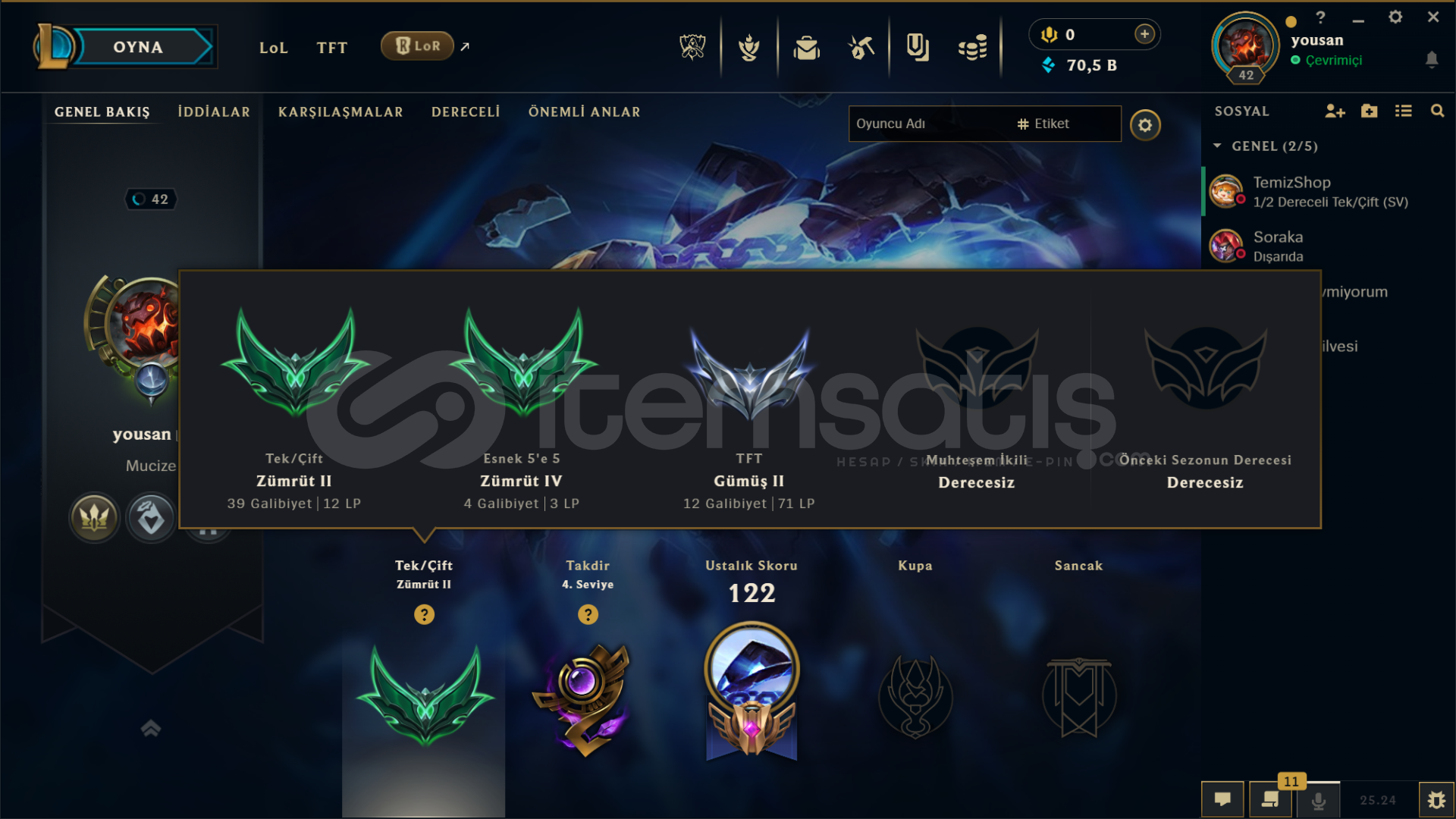 41 lvl Elle kasılmıştır mmr yüksek hesap zümrüt 2 23 lp dir şuan hesap . 30 lp geliyor 12 gidiyor esnek zümrüt 4 23 şampiyon açık çantada açmak istediğiniz şampiyon var 20 ihtişamlı öz var 4 seviye takdir 66 k öz var açık kostüm yoktur isim değiştirme mevcuttur sorunsuz oynayabilirsiniz ilk sahibiyim pişman olmazsınız kostümleri ister açın ister birleştirin