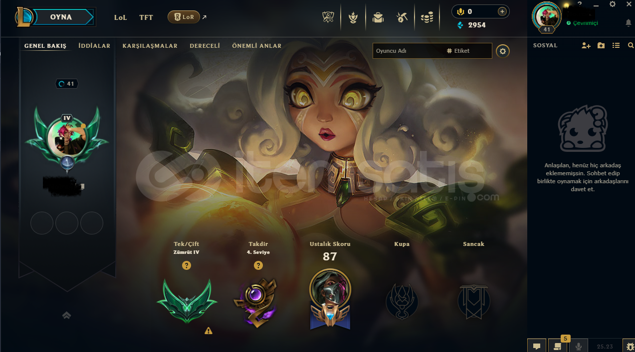 Hesap 41 level olup zümrüt 4 ligindedir içerisinde 54 karakter 9 ise kostüm bulunmaktadır taktir seviyesi de 4 tür