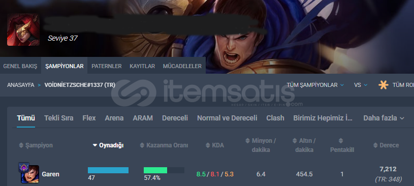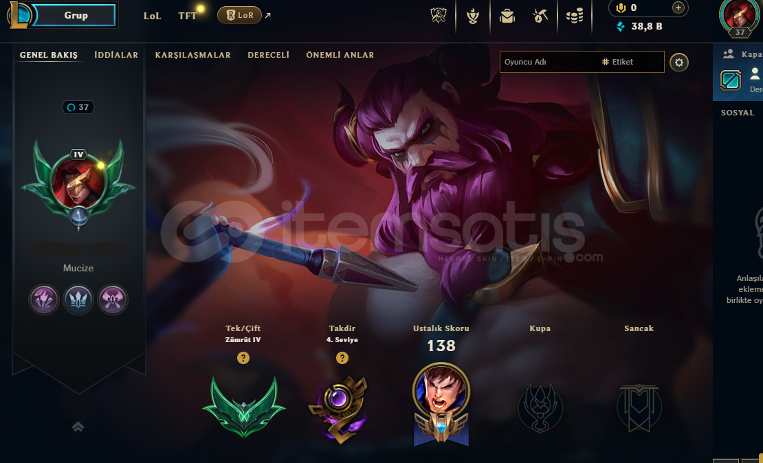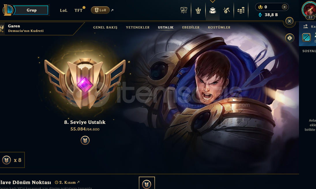 ⭐TR- GAREN- MAİN⭐2025 HESAPHESAP TR ZÜMRÜT 4 - 8LP37 LVL VE 58 SAMPİYON BULUNMAKTADIREKKO GAREN VE YASUO MAİN 17 KOSTÜM BULUNMAKTADIR40K MAVİ ÖZ VAR35 GALİBİYETLİ DERECESİ YENİDİR AZ MAÇ ATILMIŞTIR