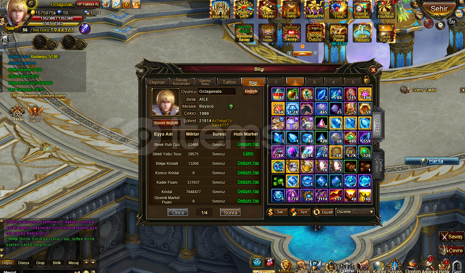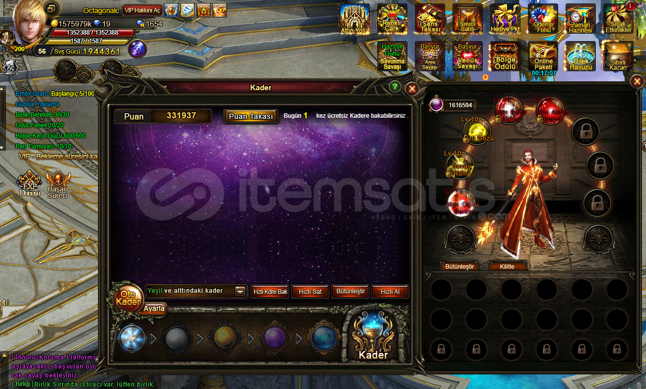 SV BİNEK TANRISI, MAX KADER, FASHİON ve BİNEK KASILI,ENVANTERDE FRİGGA, ODİN, BİRDEN FAZLA GAİA ve BİRDEN FAZLA ATHENA PERİ,(KIRMIZI ODİN)TİYAR YAPILABİLİR,ARKEOLOJİ; LEVEL 3ASTROLOJİ; ORTA DERECEBİRLİK DEPO FULL,BİNEK RUH DEĞERİ; 105800VIP LVL 9HESABI ALAN KİŞİ İÇİN ÇOK GÜZEL GELİŞTİRİLEBİLİR BİR HESAPTIR.HESAP Bİ...