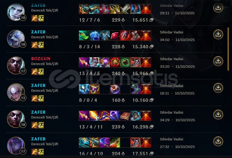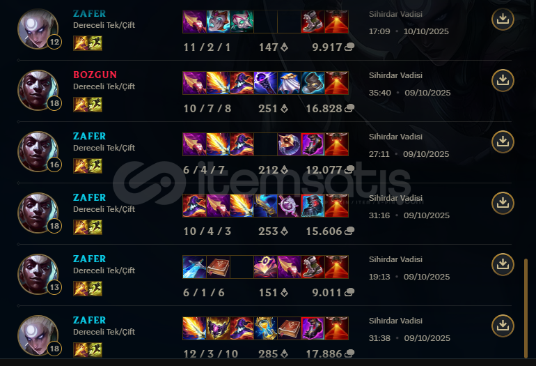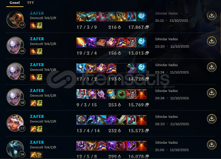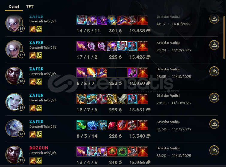 Merhaba arkadaşlar sezon 6dan beridir oynayan oyuncuyum. Grandmaster seviyesindeyim.Bu işi ticaret için yapmıyorum ihtiyaçtan ötürü yapıyorum bu sebeple hızlı script kullanıp para kazanmaya çalışan insan müsvettelerinden değilim.Nişancı hariç her rol mainim. Düşük elolarda nişancı rolünü oynuyorumDiana, Kayn, Talon, Twisted Fate, Garen, Teemo ve Briarda T...