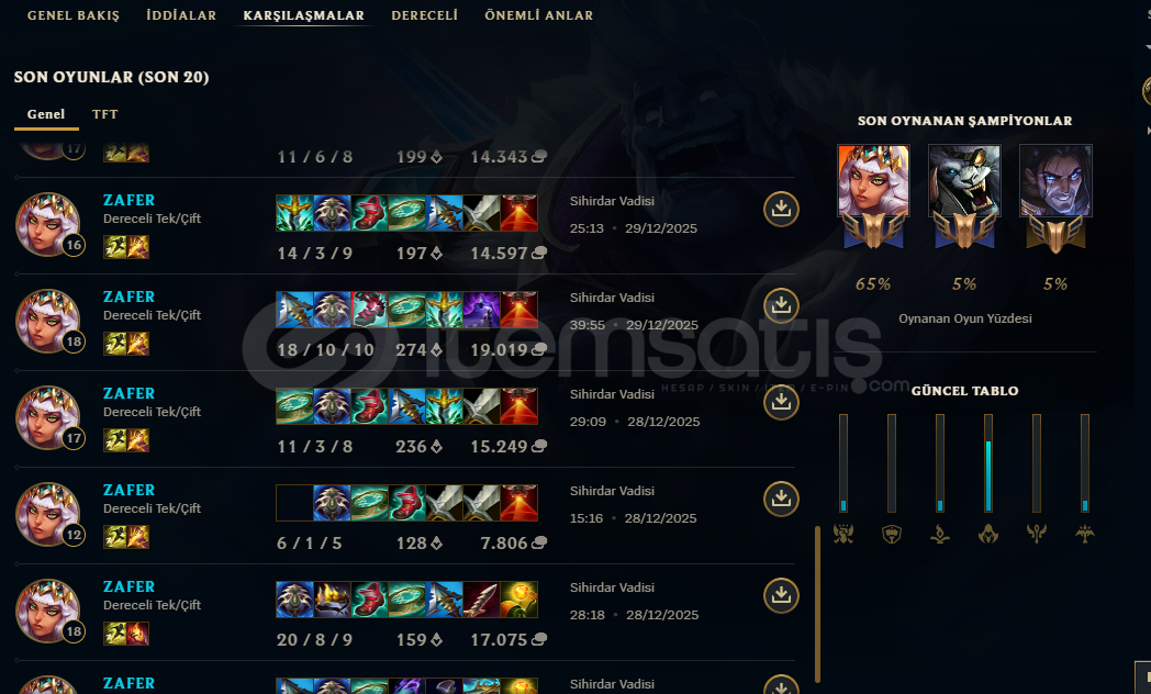 Yeni yıla özel Kampanyalı EloBoost Hizmeti - İletişime Geçerek Fiyat Alabilirsiniz 7/24Merhaba, sezon 6dan beri oynuyorum. Şu anda Grandmaster seviyesindeyim.Bu işi ticaret için değil, ihtiyaçtan dolayı yapıyorum.Script, bot veya benzeri şeyler kullanmam; tamamen tecrübe ve oyun bilgisiyle oynarım.Roller: Nişancı hariç her rol mainim düşük elolarda ADC de oynuyorum.Main şamp...
