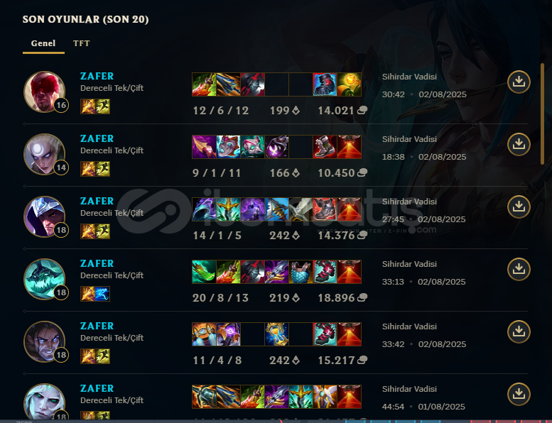 Merhaba arkadaşlar sezon 6dan beridir oynayan oyuncuyum. Grandmaster seviyesindeyim.Bu işi ticaret için yapmıyorum ihtiyaçtan ötürü yapıyorum bu sebeple hızlı script kullanıp para kazanmaya çalışan insan müsvettelerinden değilim.Nişancı hariç her rol mainim. Düşük elolarda nişancı rolünü oynuyorumDiana, Kayn, Talon, Twisted Fate, Garen, Teemo ve Briarda T...