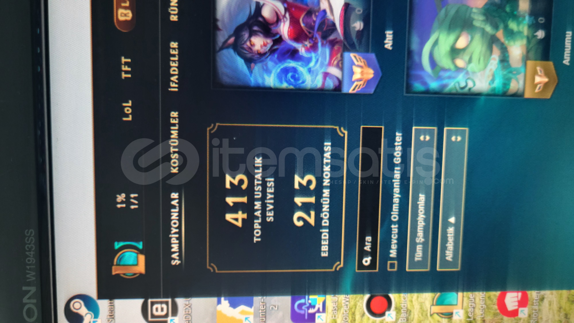 331 lvl nadir dünya şammpiyonası skinleri yüksek ustalık hesabı açıklamasına hoş geldiniz2016 dünya şampiyonası zed fpx malzpite kaleci mokai 2018 dünya şampinyonası khazix ve daha fazlasıda var normal olarakk nadir ve değerli skinkler413 toplam usatlık puanıHesap çok iyi ve baya kalitelidir