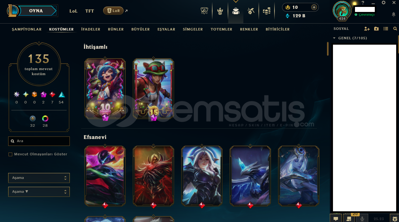 424 LvL LoL Hesabı – 135 Skin, Full Champ