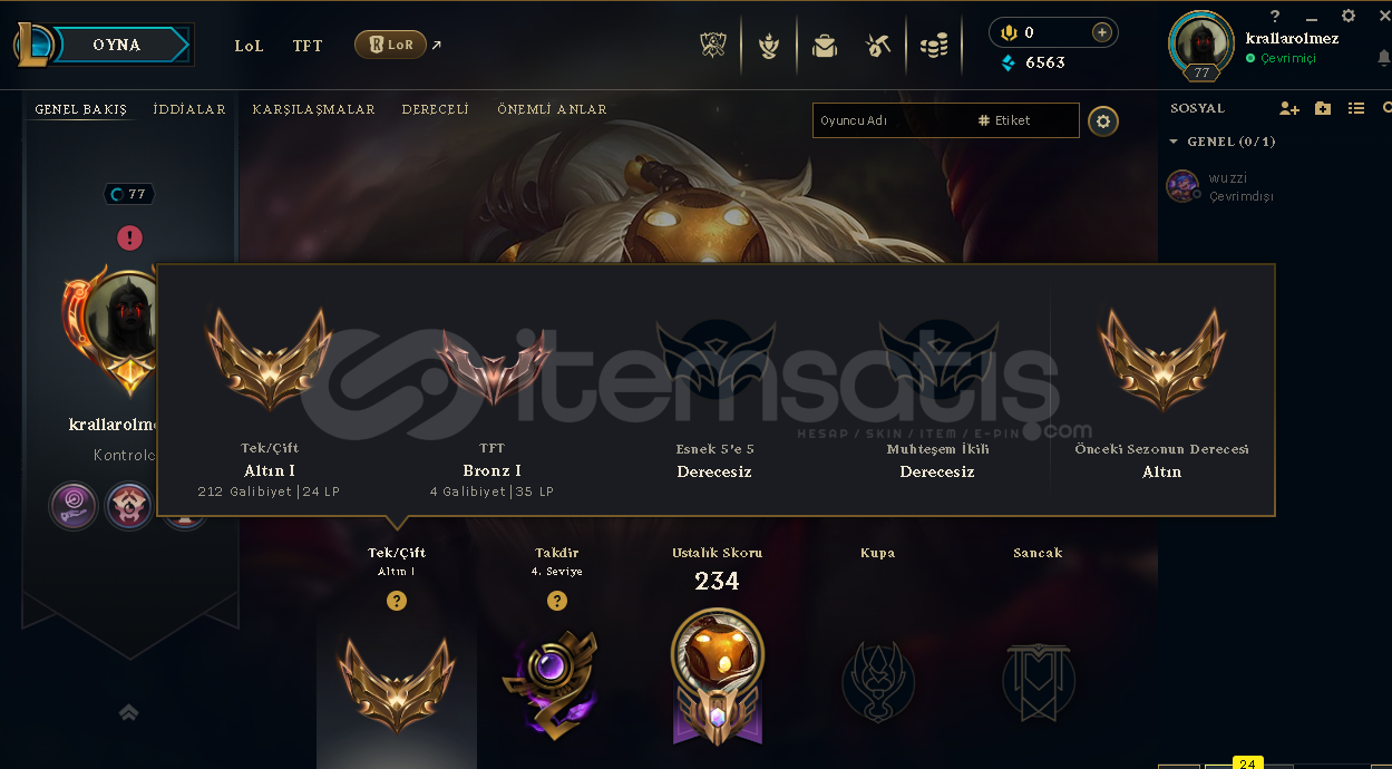 77.SEVİYE ALTIN 1 RANK10 KOSTÜM VAR 111 ŞAMPİYON 4.SEVİYE TAKDİR11.SEVİYE BARD9.SEVİYE MALPHİTEENVANTERDE 2 TANE KOSTÜM VAR İG CAMİLLE , KOD ADI CAMİLLE 22 TANE İFADE 67 SİMGE