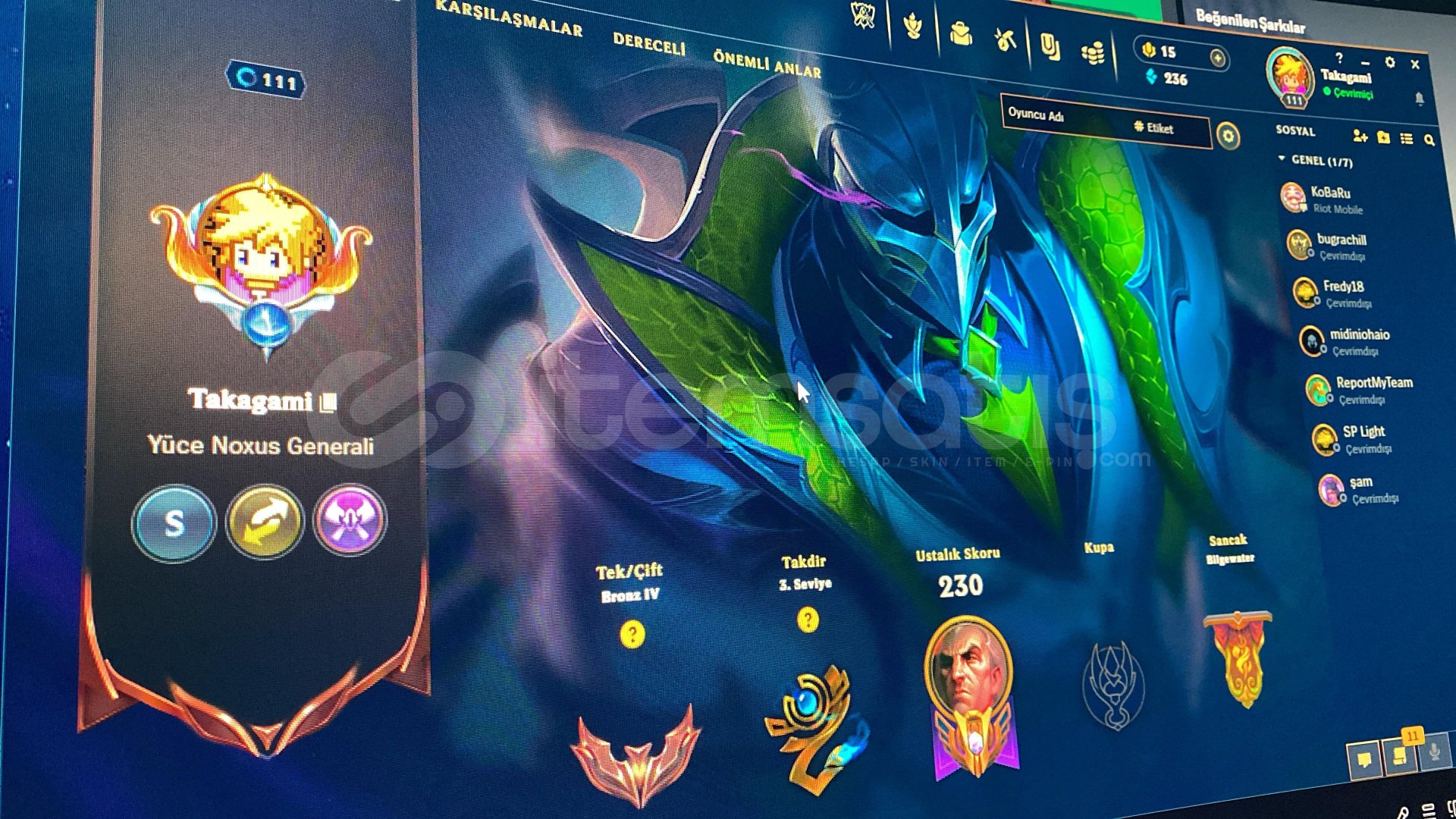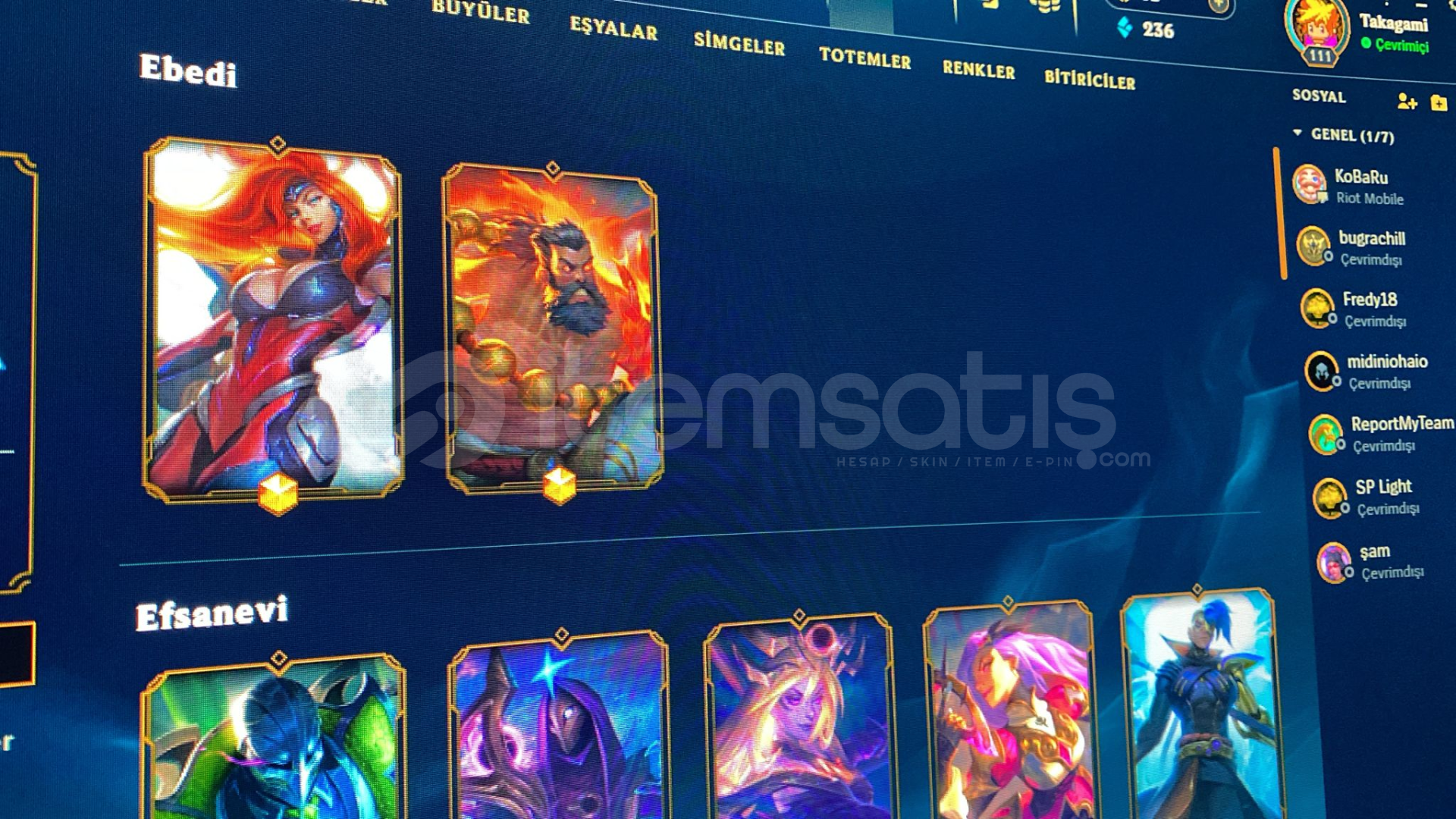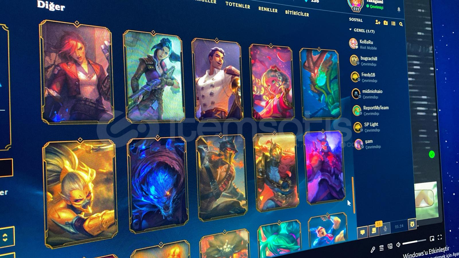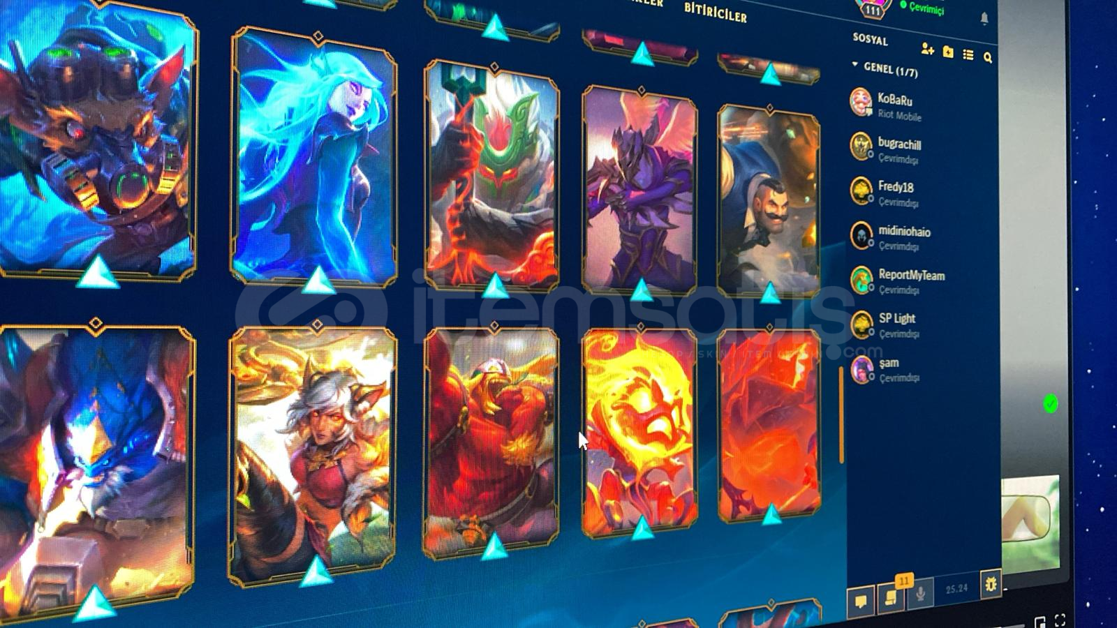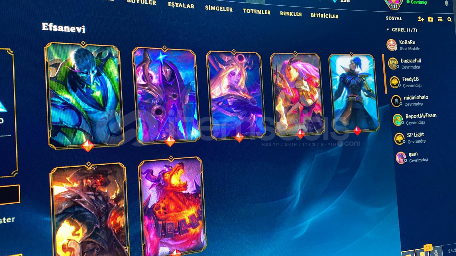 hesabım güzeldir yasuo yone katarina zed gibi karakterleri main olanlar için ideal bir hesaptır 59 kostüm 111 Lvl 8 tane sancağı olan bi hesaptır maili değişir