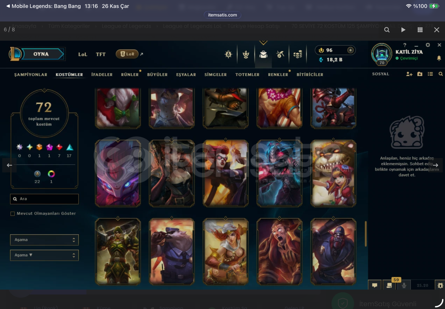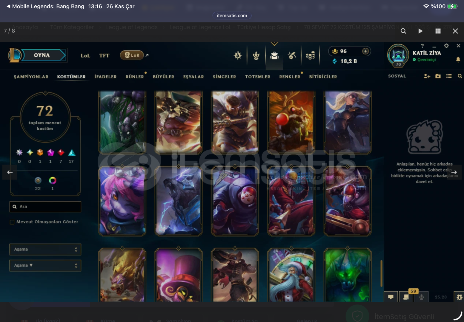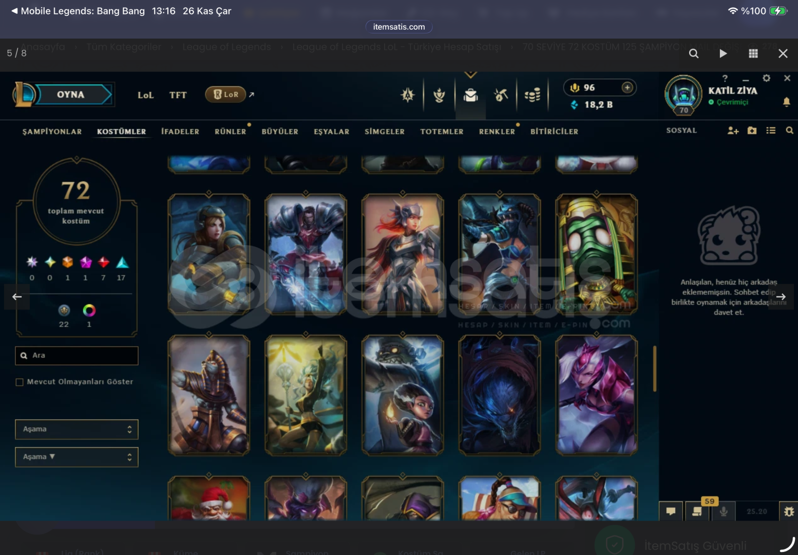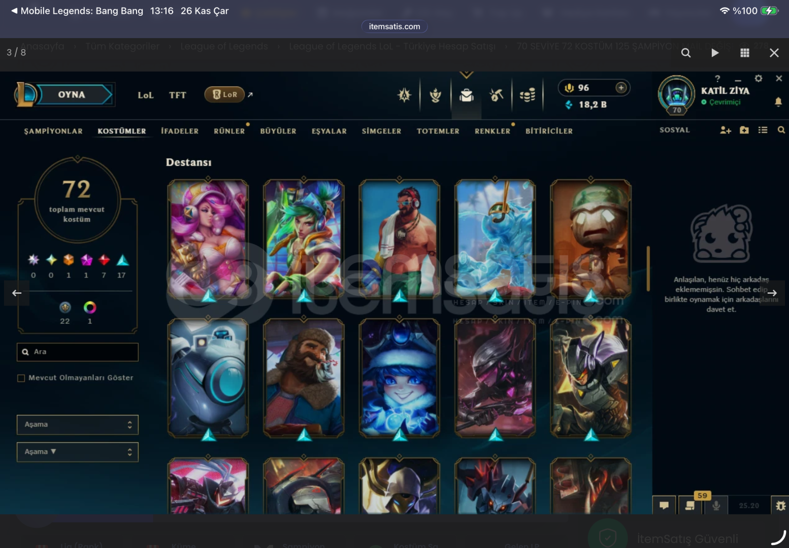 hesap tr hesabıdır.hesabın maili değişmektedir.hesabın herhangi bir banı yoktur.hesap 3 takdir seviyesine sahiptir.hesapta 125 şampiyon, 72 kostüm, 18,211 mavi öz vardır.hesapta 1 ebedi, 1 ihtişamlı, 7 efsanevi, 23 destansı kostüm vardır.ekran kaydı açmayı unutmayınız.