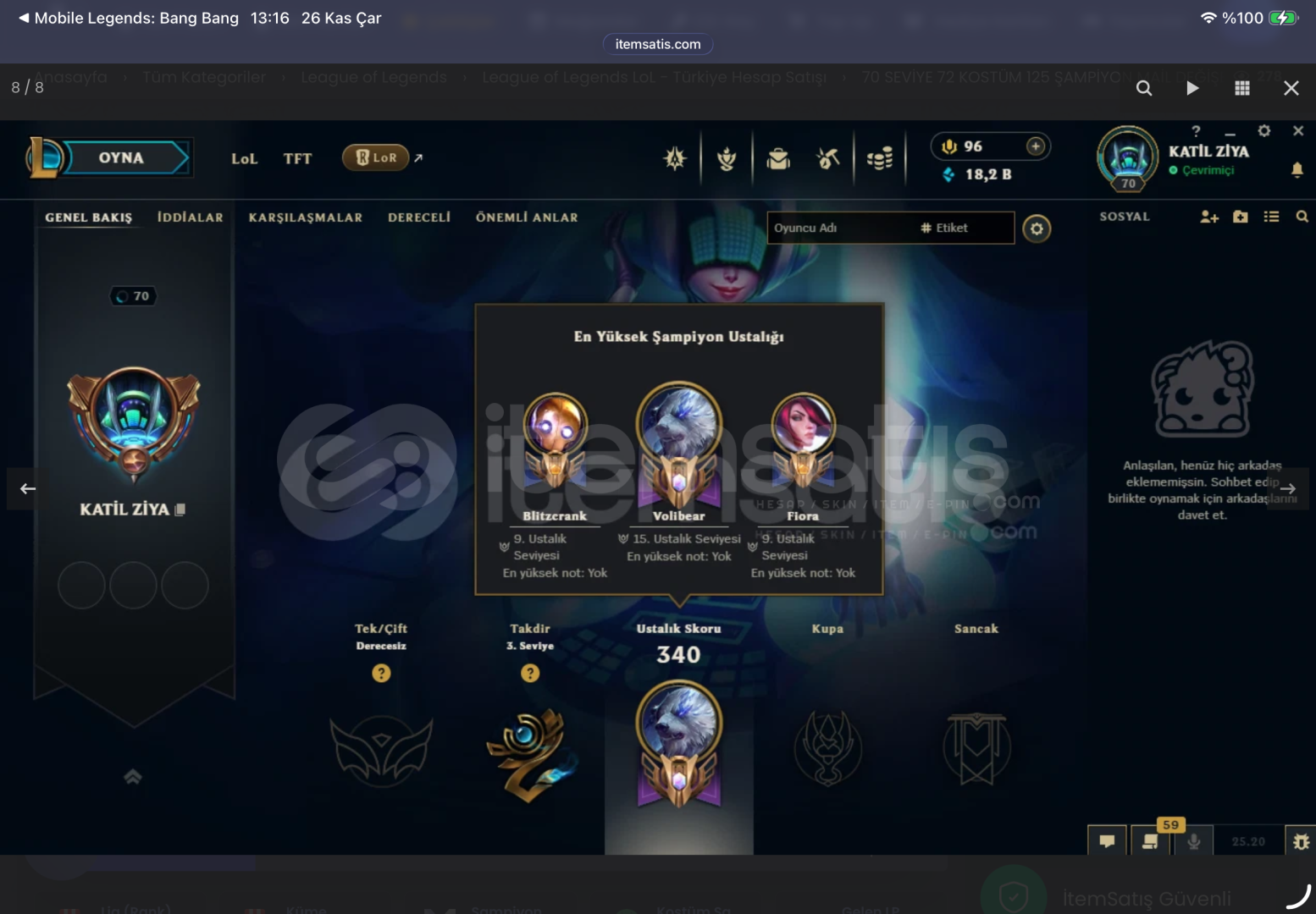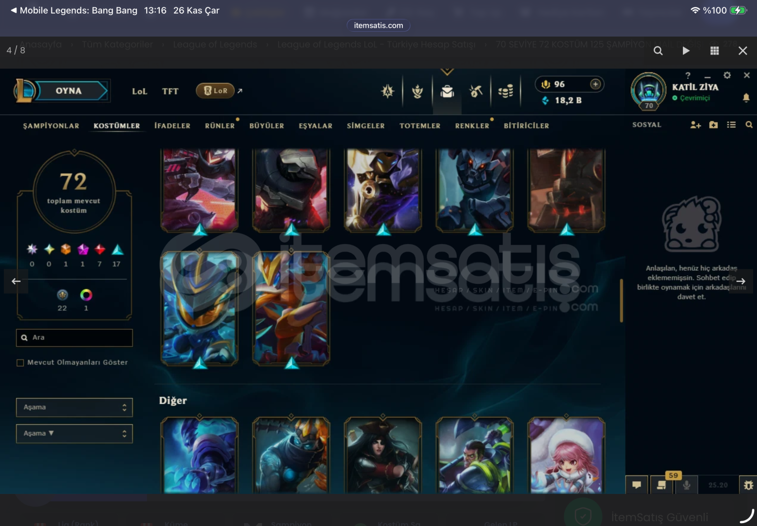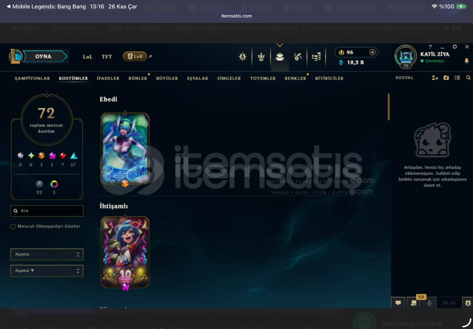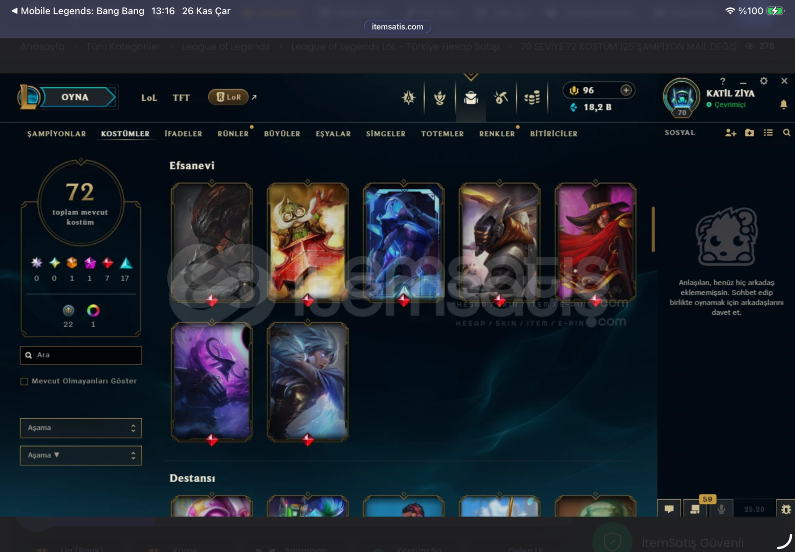 hesap tr hesabıdır.hesabın maili değişmektedir.hesabın herhangi bir banı yoktur.hesap 3 takdir seviyesine sahiptir.hesapta 125 şampiyon, 72 kostüm, 18,211 mavi öz vardır.hesapta 1 ebedi, 1 ihtişamlı, 7 efsanevi, 23 destansı kostüm vardır.ekran kaydı açmayı unutmayınız.