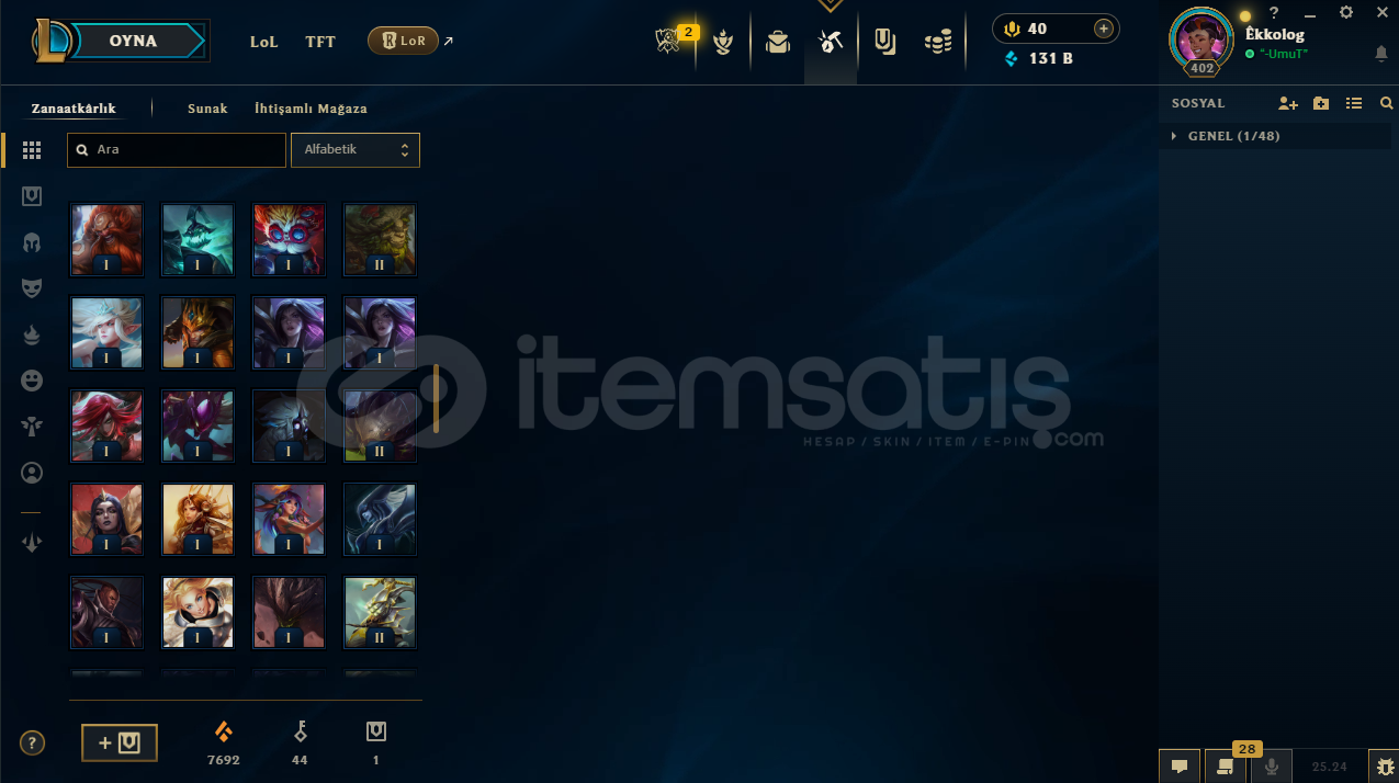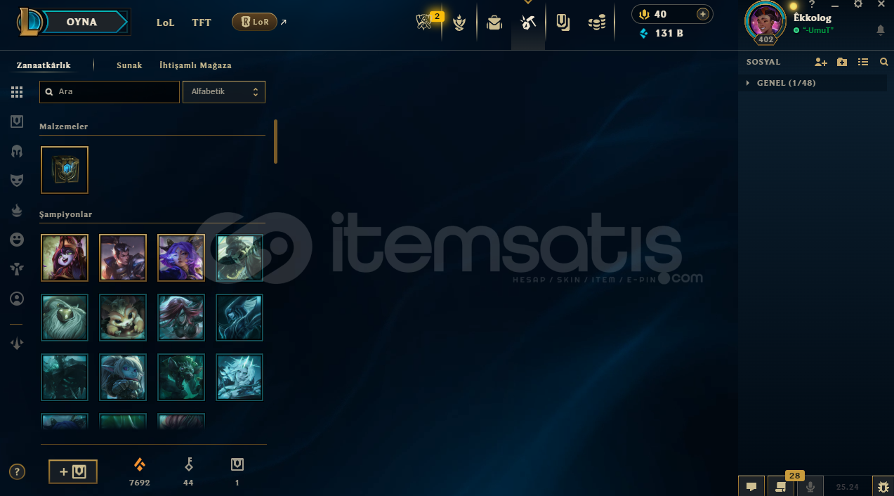 İçerisinde tüm Şampiyonlar, 102 Kostüm bulunmaktadır.bot lane maindir. Tüm herolar mevcuttur.Hesap Silver TR ANA Hesabıdır.Hesabın epostasına erişim yoktur random hesaptır.Herhangi bir sıkıntıda en iyi desteği vermeye çalışacağız.Detaylı bilgi için mesaj atabilirsiniz. Hesap stok olarak verilir o yüzden istediğiniz saate satın alabilirsiniz hesap size ...
