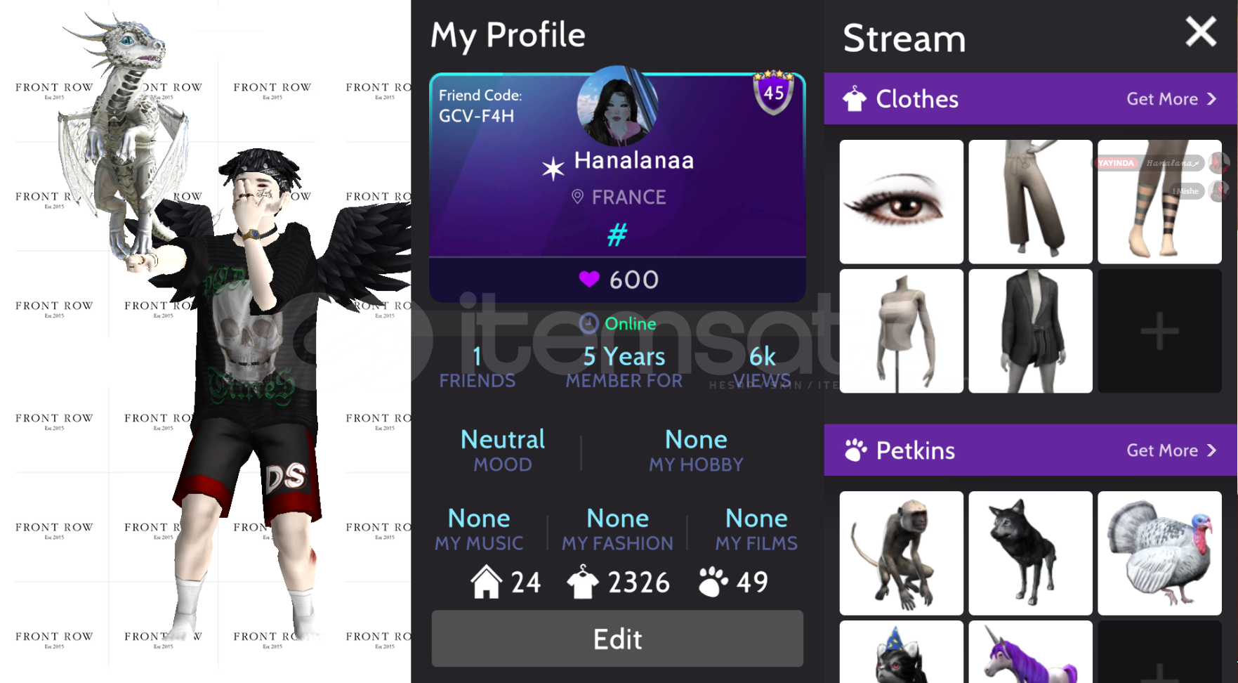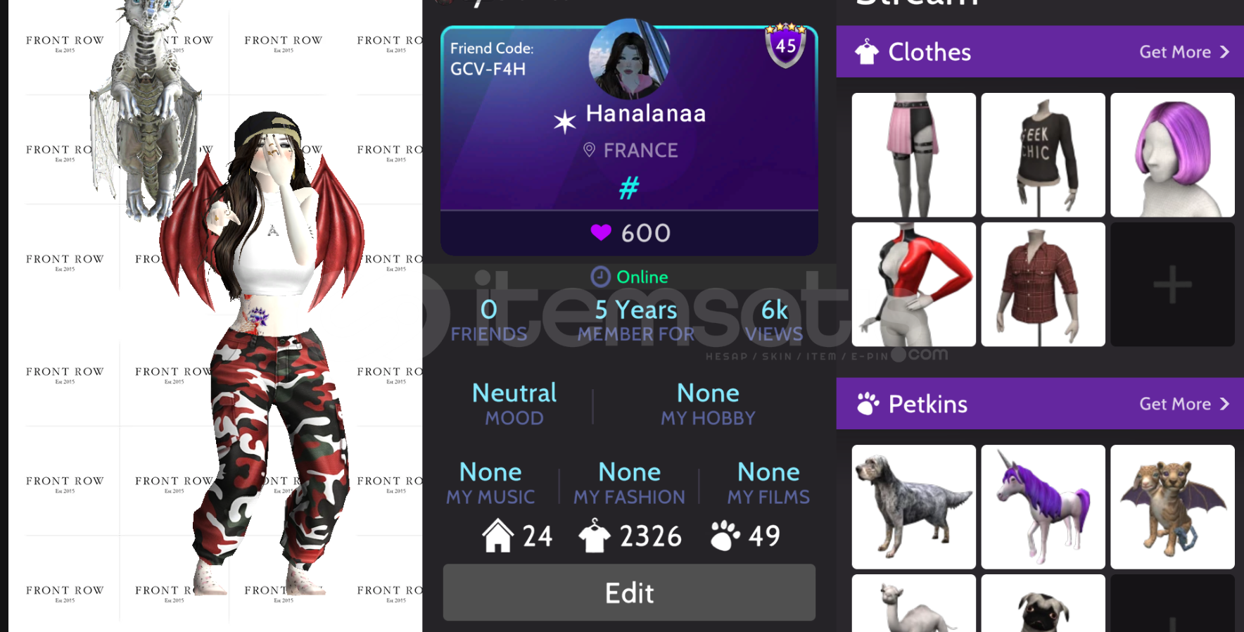 21 kanat kız 3 kanat erkek51 set old setler var vampire wolf hero zombie vs.2326 kıyafet1k elmas49 ev24 evcil hayvan 1 adet ejderhada var6000 profil görüntüleme5 yıllık hesap600 beğeni83 dans6 tane 2li dans134 poz old pozlarda var25 tane 2li poz35 tane animasyon45 lvl