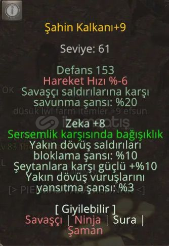 +9 ŞAHİN KALKANI= SERSEMLİK KARŞISINDA BAĞIŞIKLIK, ZEKA 8, YAKIN DÖVÜŞ BLOKLAMA 10, ŞEYTAN 10, YANSITMA 3