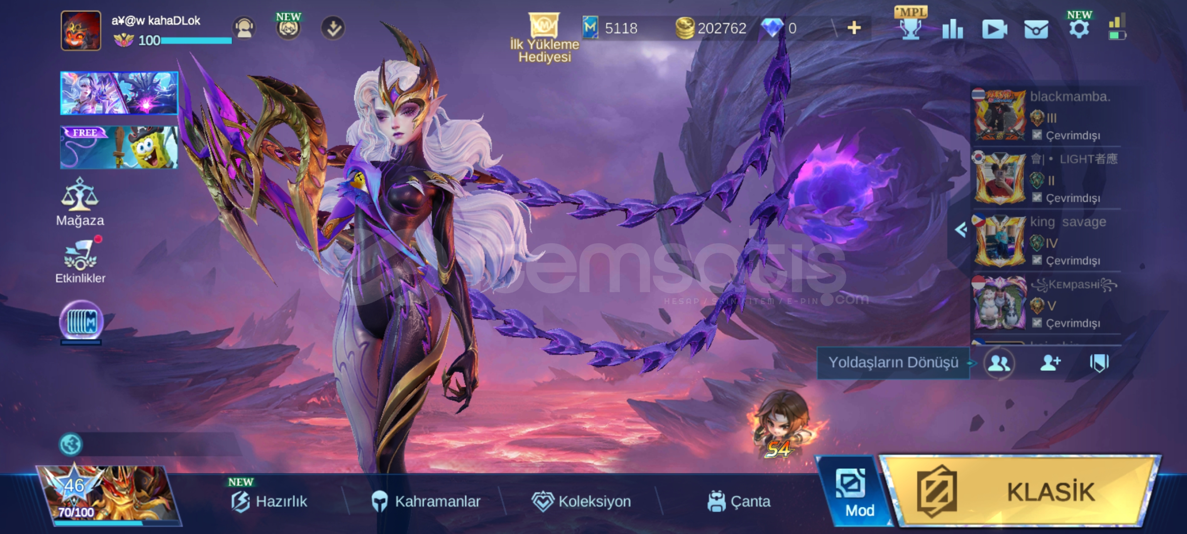 📌 HESAP ÖZELLİKLERİ⭐ Hero Sayısı: 130/130 (Tüm karakterler açık – full havuz)🎨 Skin Sayısı: 211🛡️ Amblem: Tümü Full Max🔐 Teslimat: Gmail şifresi ile teslim edilir — diğer tüm bağlar tamamen ölüdür, hesap %100 size ait olur.🎁 Özel & Değerli Kostümler:Gara ValeCollector NataliaPegasus Seiya BadangEpic NanaOnlarca Epic, Spe...
