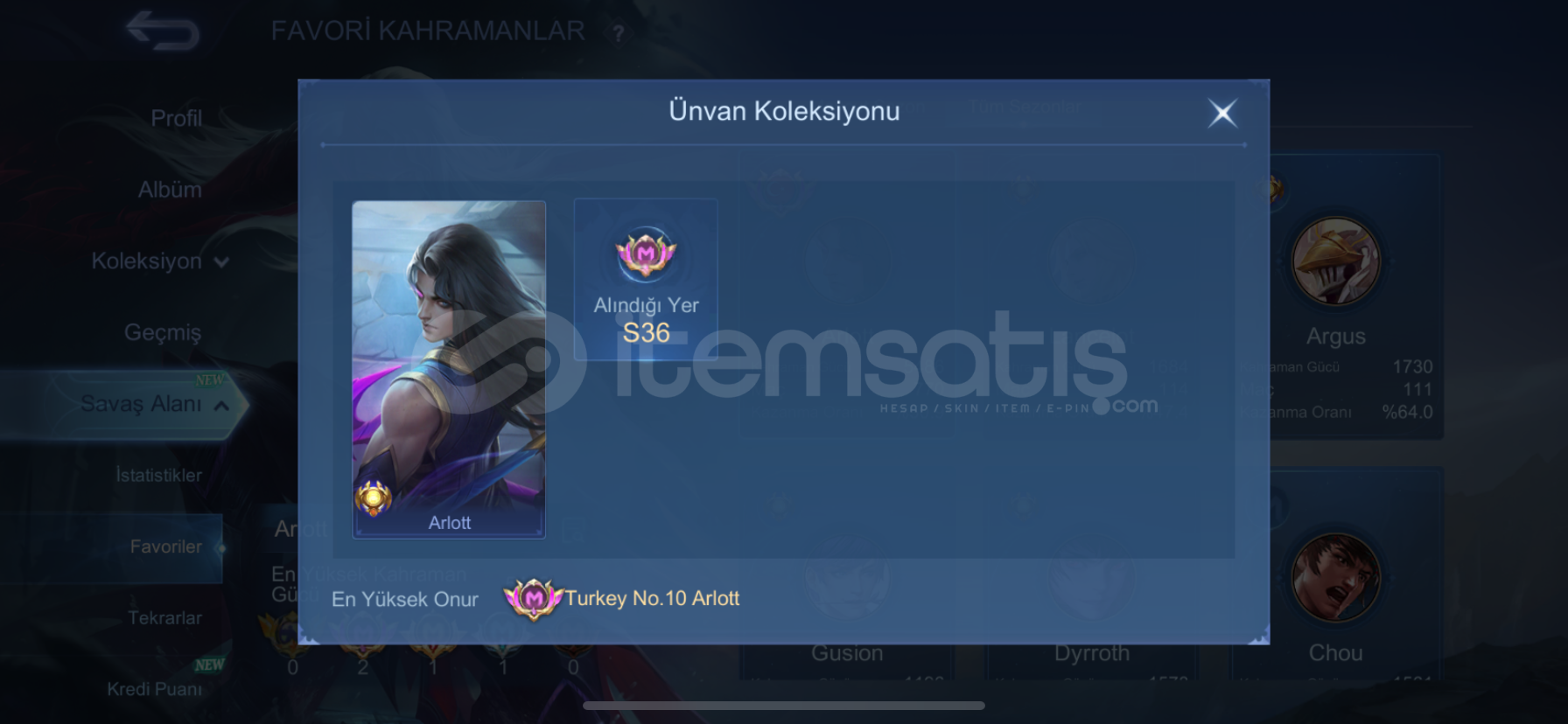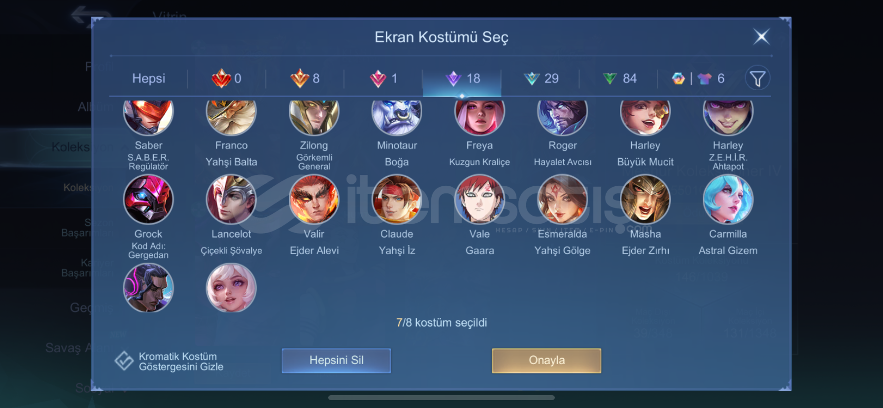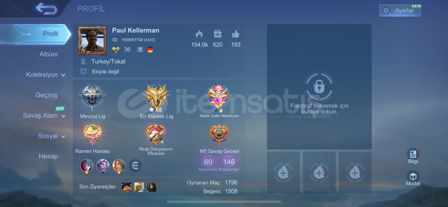 Mobile Legends hesabımı satıyorum.🔹 Toplam Skin: ~146🔹 Nadir / Collab Skinler:Cecillion – HisokaSuyou – Sasuke UchihaLing – NeobeastMoskov – Ejder İblisiLancelot – Tapınak MuhafızıSelena – Kül LanetiKarina – LeonaDyrroth – Orochi Chris🔹 Rank Geçmişi: En yüksek 68 yıldız🔹 Hesap eski, emek verilmiş ve koleksiyon değeri yüksek🔹 Ban...