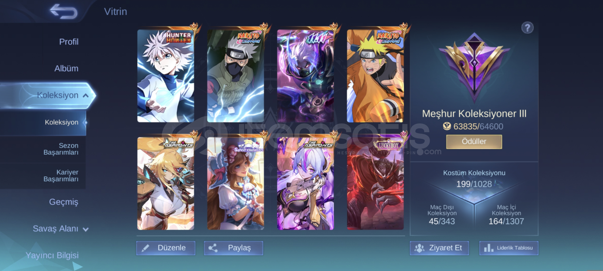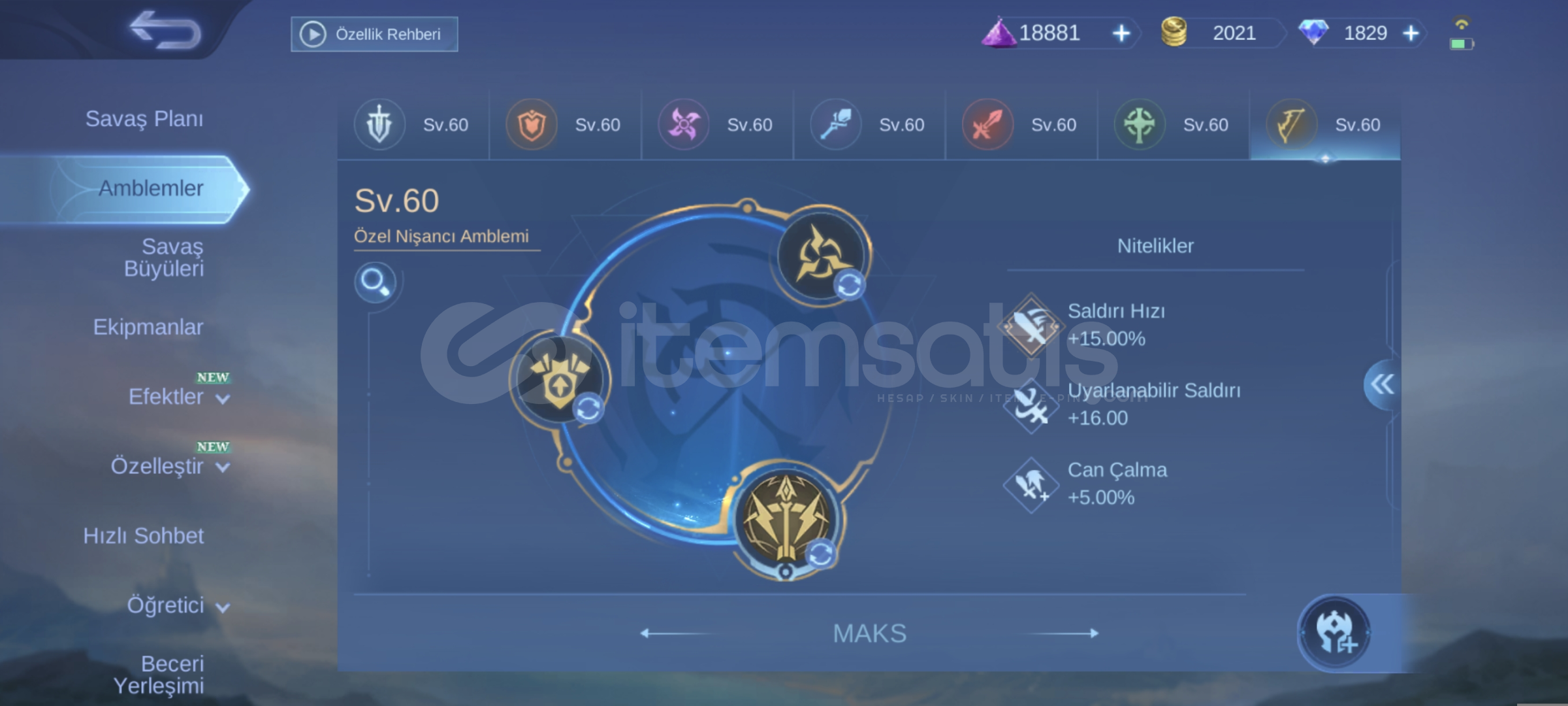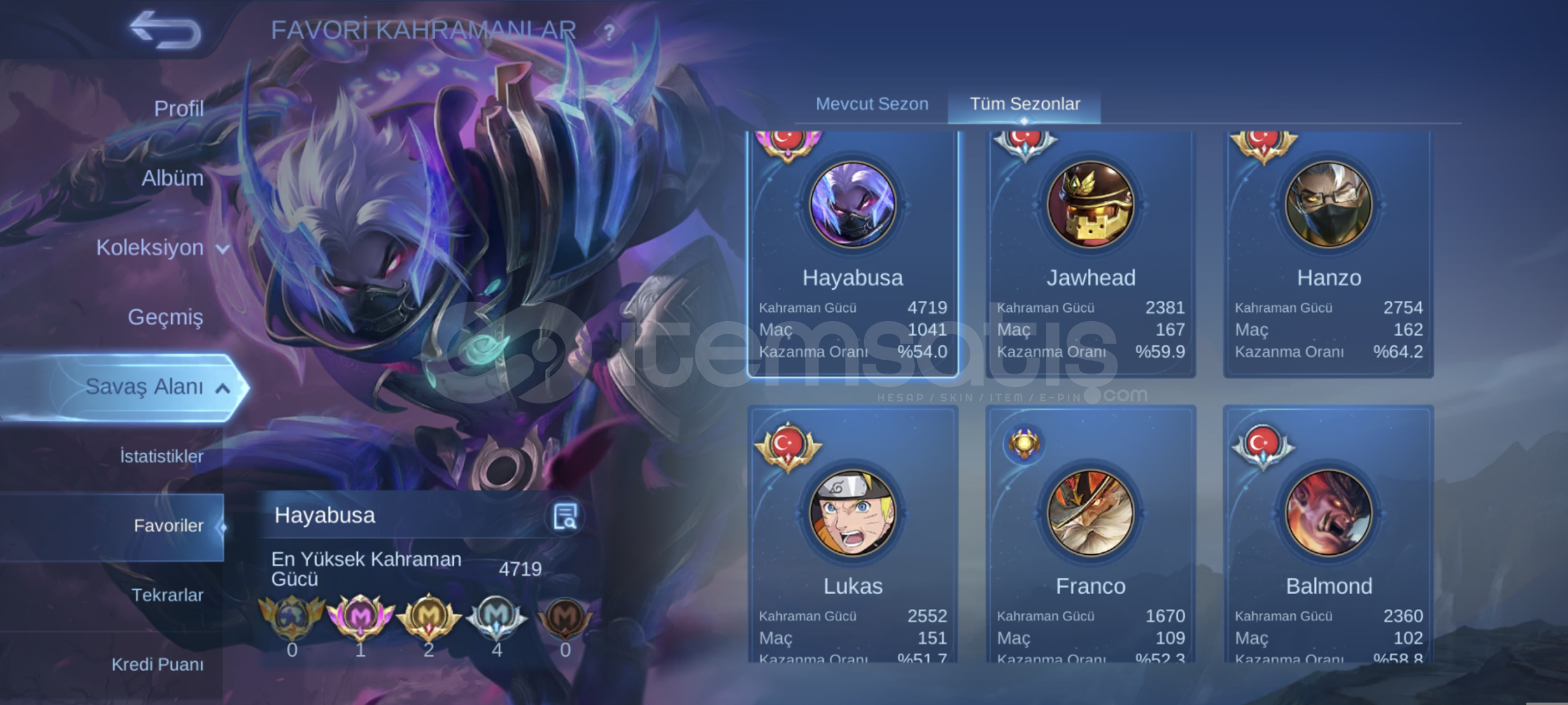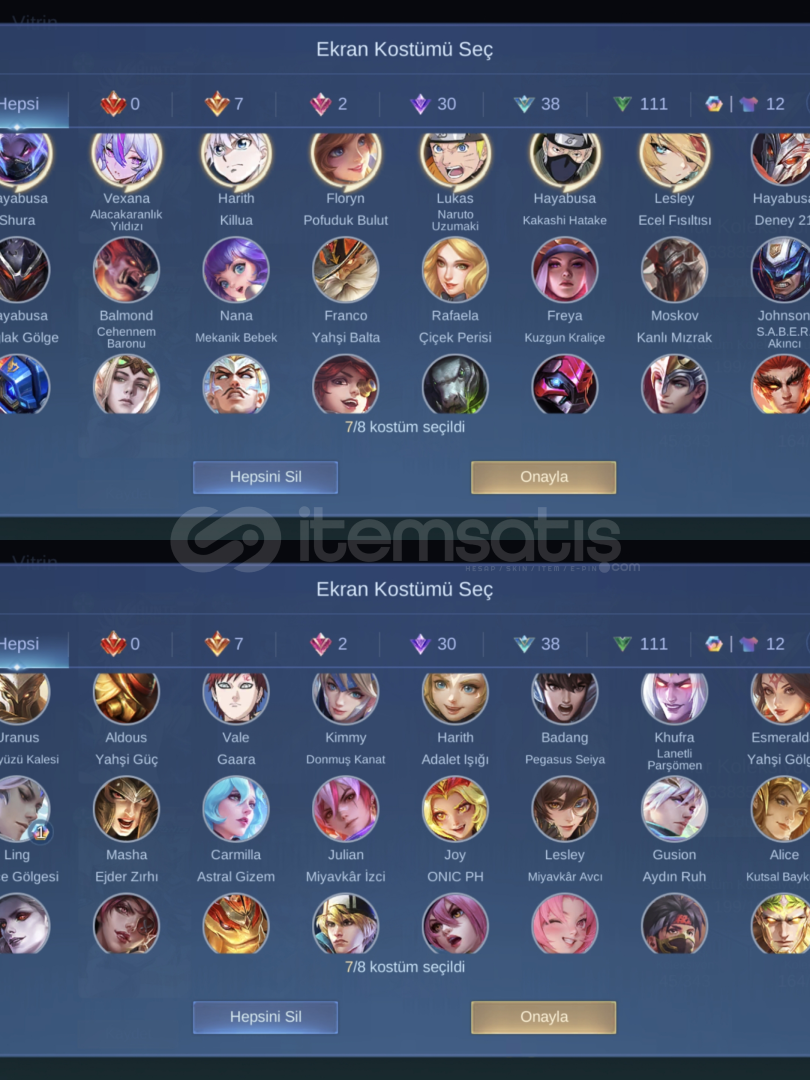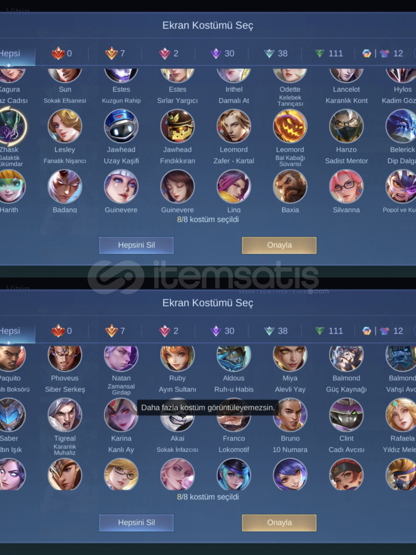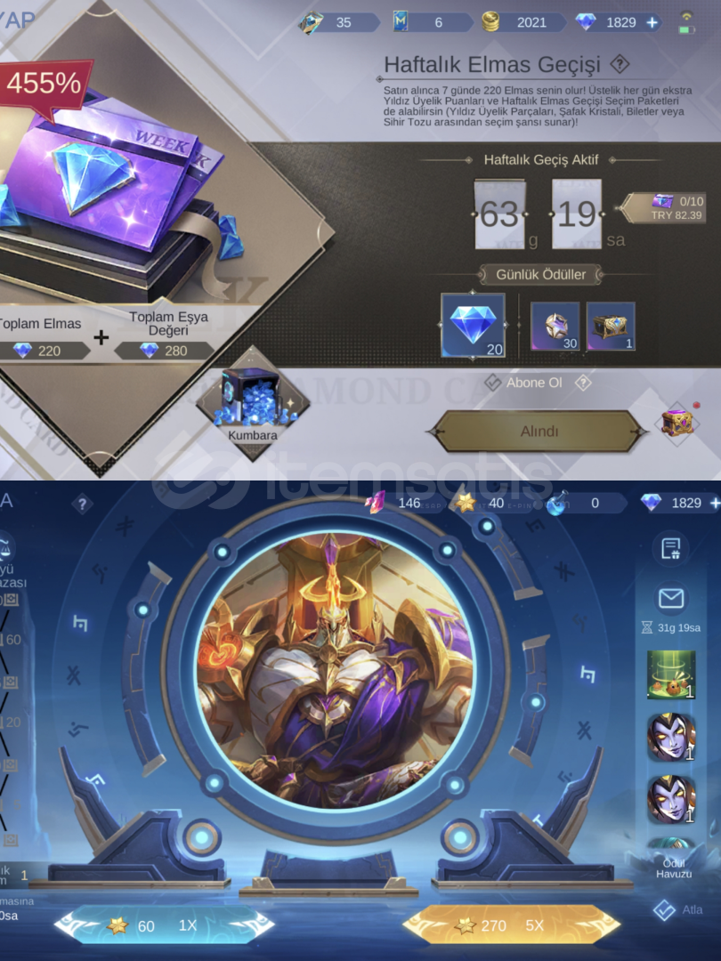 1829 elmas vardir 63 gun sonra 63x20=1260 elmas daha gelecek. 146 legend skin parcasi var, 30 mistik skin parcasi var, amblemler max, TLPH okuz base efekti, skinler emojiler dolu, tek bağ moonton temiz tr hesabi.