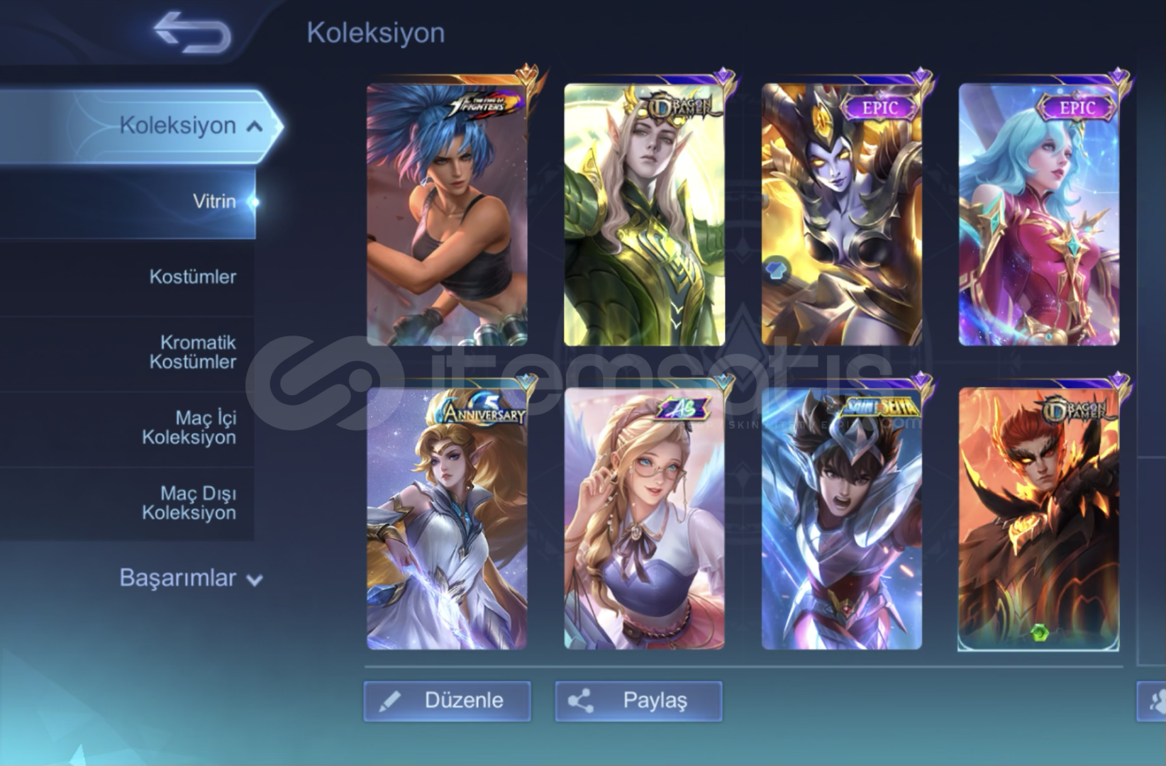Merhabalar, hesabım sanırım 2021 kayıtlı ve eski bir hesap. Satma nedenim artık oyunların sarmaması. Birçok premium ve nadir kostüm bulunmaktadır. Eskiden Cecillion karakteri ile Türkiye sıralamasında 1. sıraya kadar yükselmiştim. Hesabın başarı oranı ve koleksiyonları ortadadır. Sadece 10 karakter eksik; onları almaya uğraşmadım.Mevcut olarak hesapta şu a...