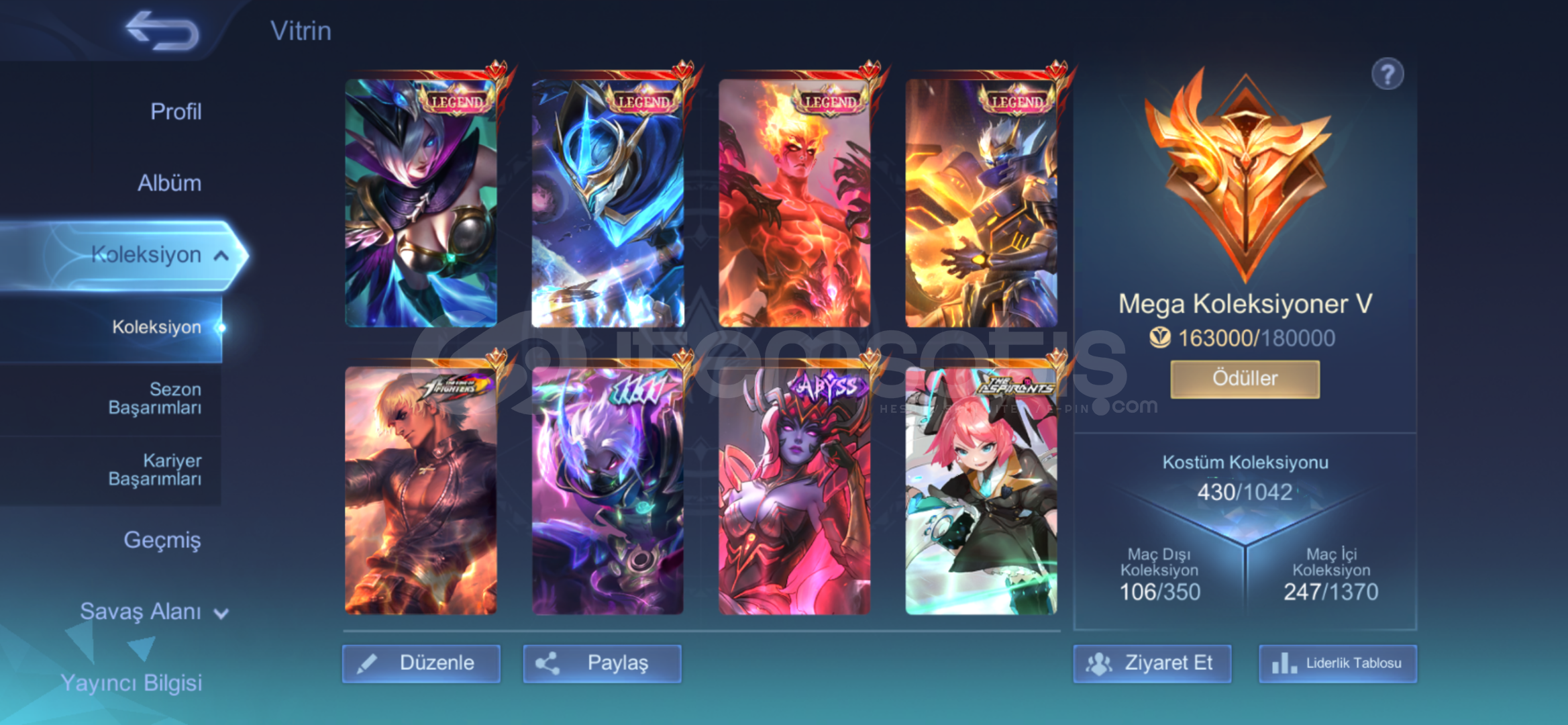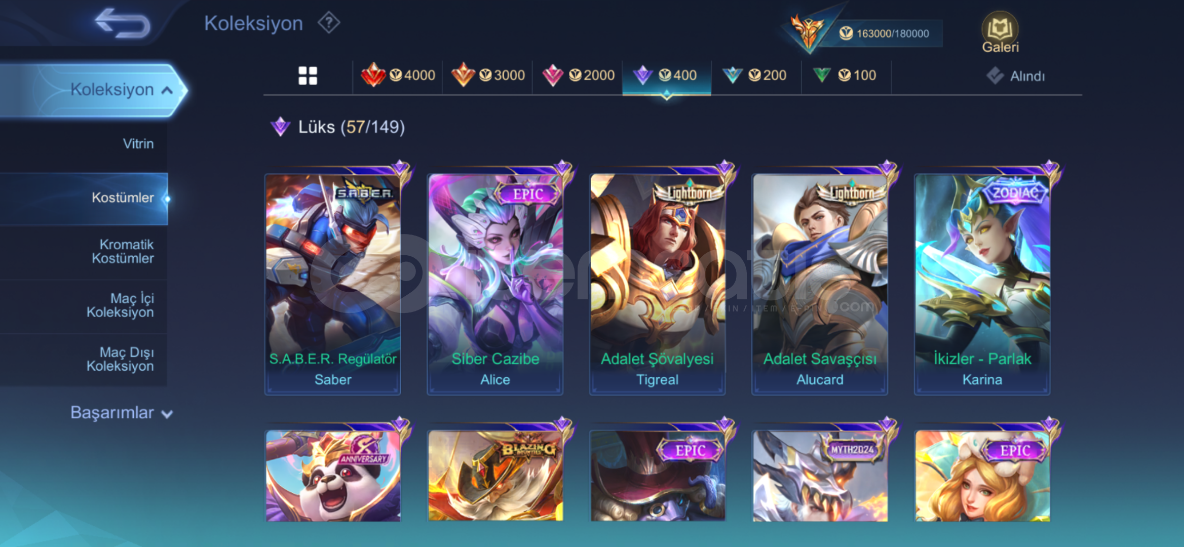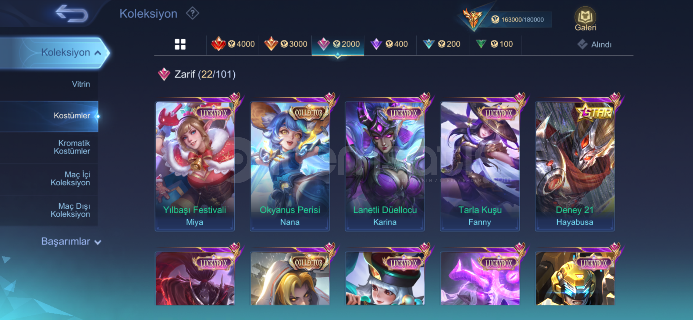 Hesabın içi doludur 4 legend gus kof ve birsürü kostüm vardır detayları fotoğrafta vardır amblem full 620 elmas vardır detay için iletişime geçebilirsiniz asia elmas