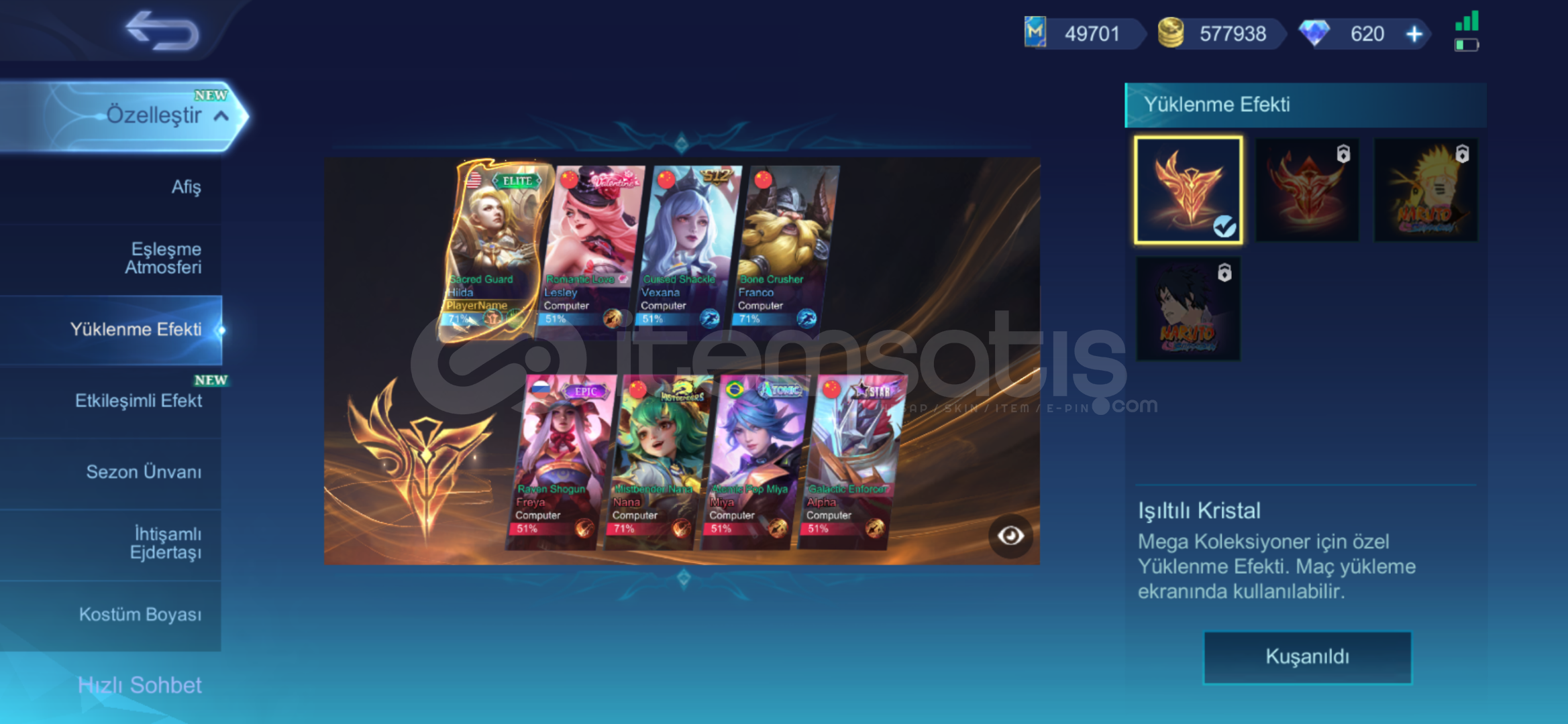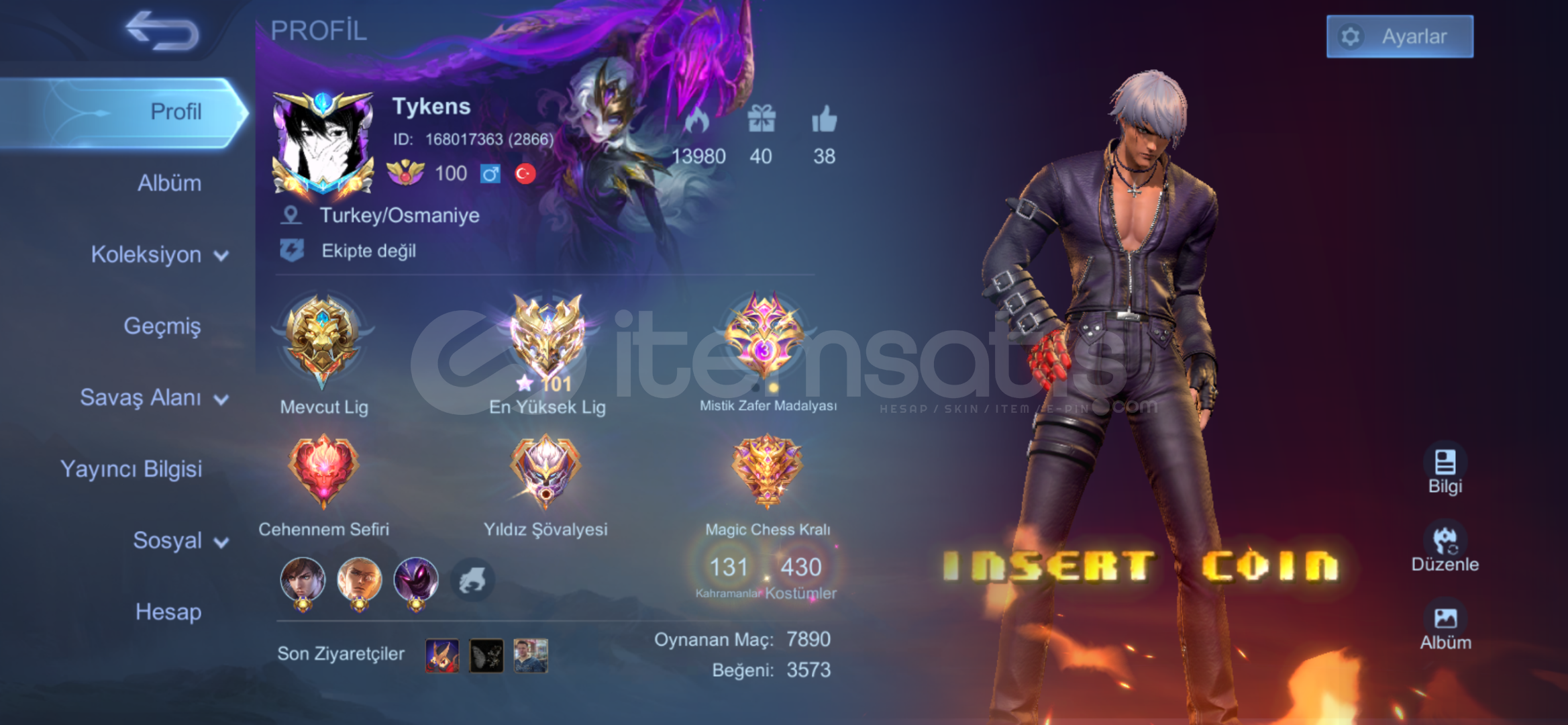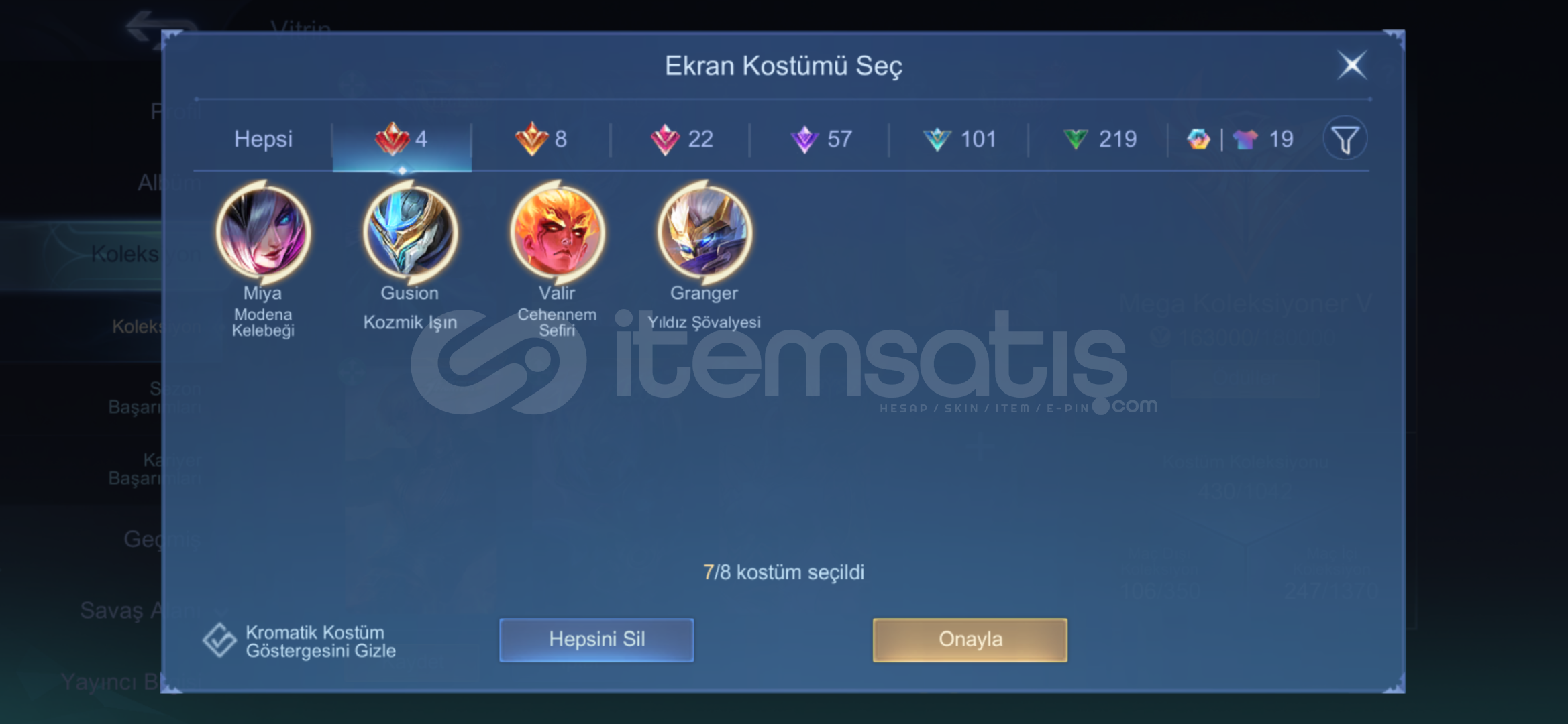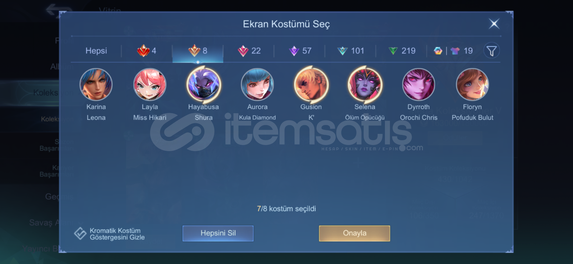 Hesabın içi doludur 4 legend gus kof ve birsürü kostüm vardır detayları fotoğrafta vardır amblem full 620 elmas vardır detay için iletişime geçebilirsiniz asia elmas