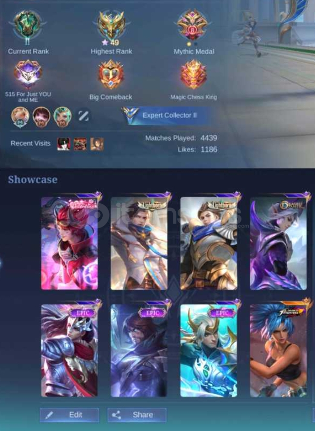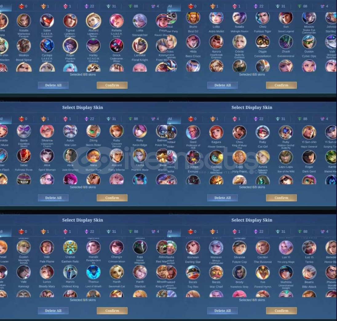 COLLECTOR NATALIA LIGHTBORN ALUCARD,TIGREAL EPIC FREYA,YI SUN SHIN,ROGER,LANCELOT TOPLAM 147 SKİN MEVCUT.AMBLEMLER MAXGMAİL İLE BERABER...